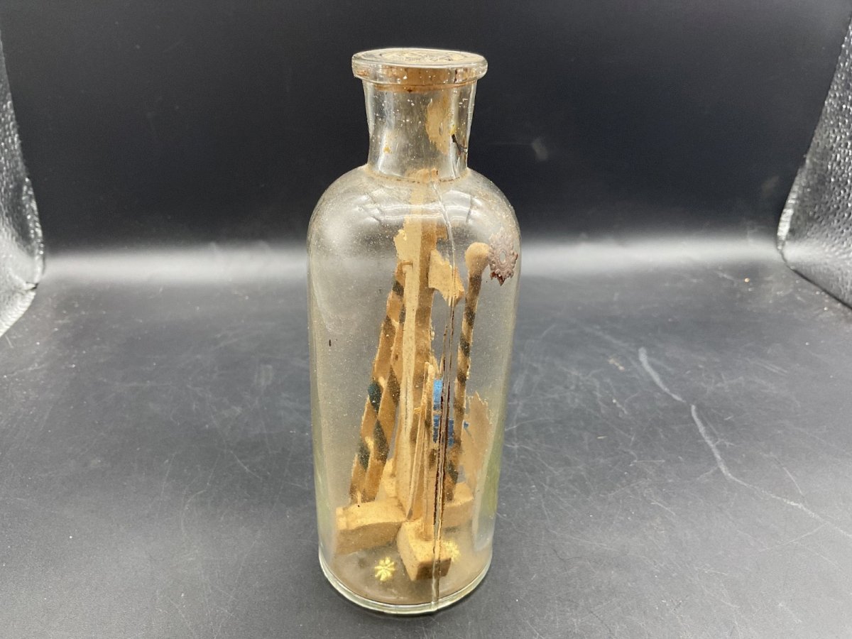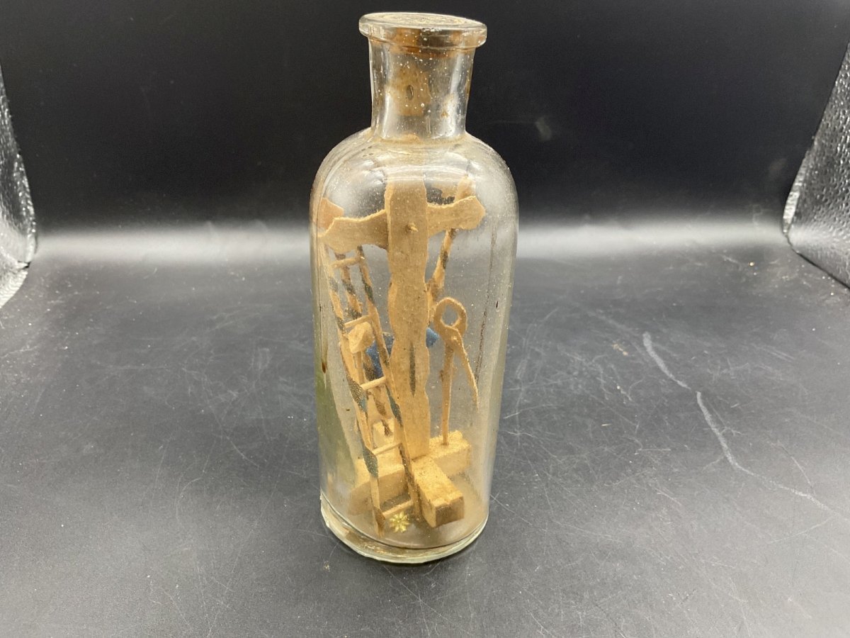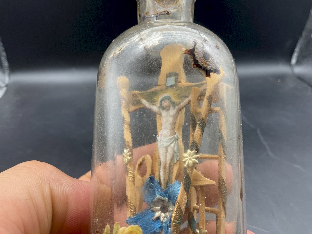 Old small bottle cross of the passion / Calvary Height: 14 cm Diameter: 5 cm Condition: Used item. Please refer to the seller's description for more details on any potential imperfections. Type: Christianity Country of manufacture: France Subtype: Reliquary Material: Glass Type: Christianity