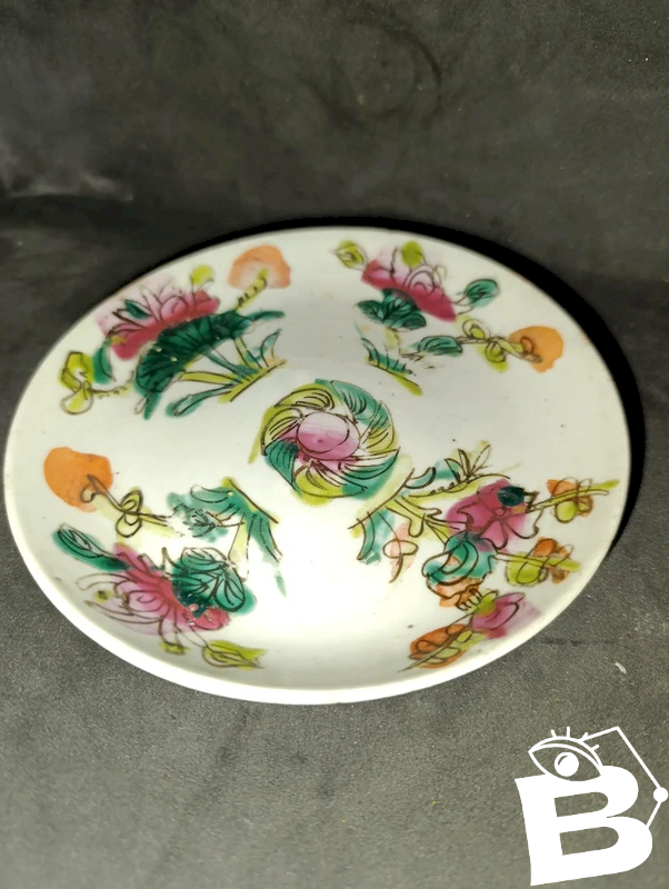 antique small dish with floral decoration of Chinese origin in good condition, age to be determined, seems to have a hallmark on the back, note a chip on the edge (see photos) diameter 13.5 cm...