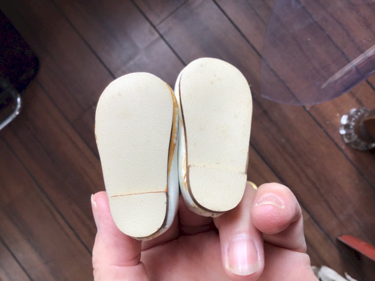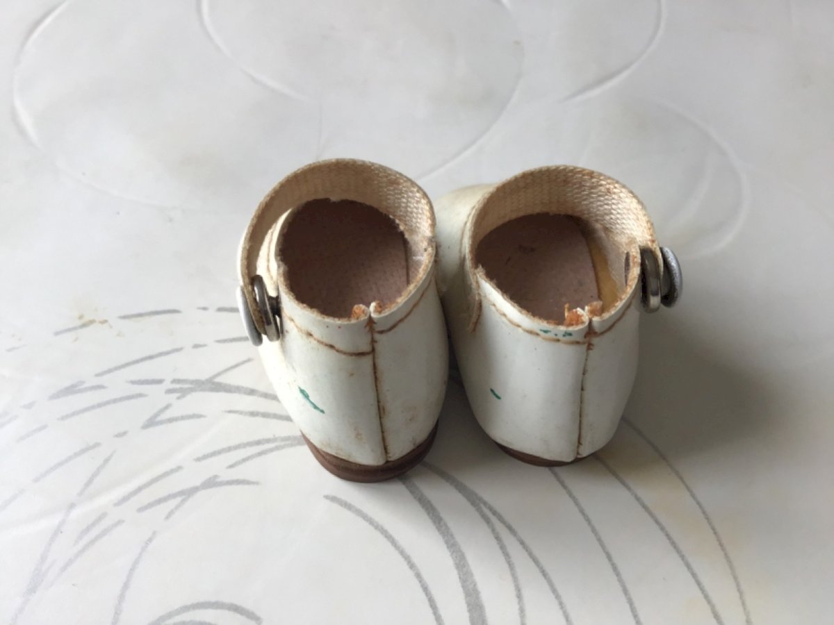 Old small pair of doll shoes with snap. Condition: Used item. Please consult the seller's description for more details... Used item: may have imperfections. Material: leather.