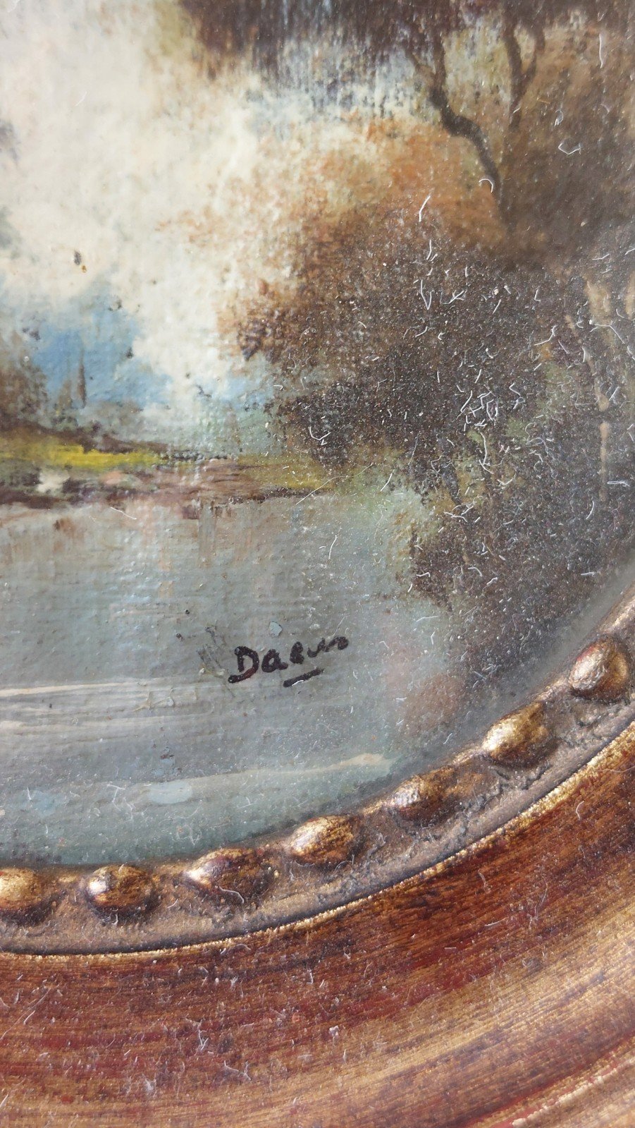 Old small miniature painting, landscape decor in good condition signed Daeus ?? diameter of the painting 8.3 cm total diameter 13 cm see photos Check out my other items! Shipping cost reduction for combined purchases Theme: Landscape