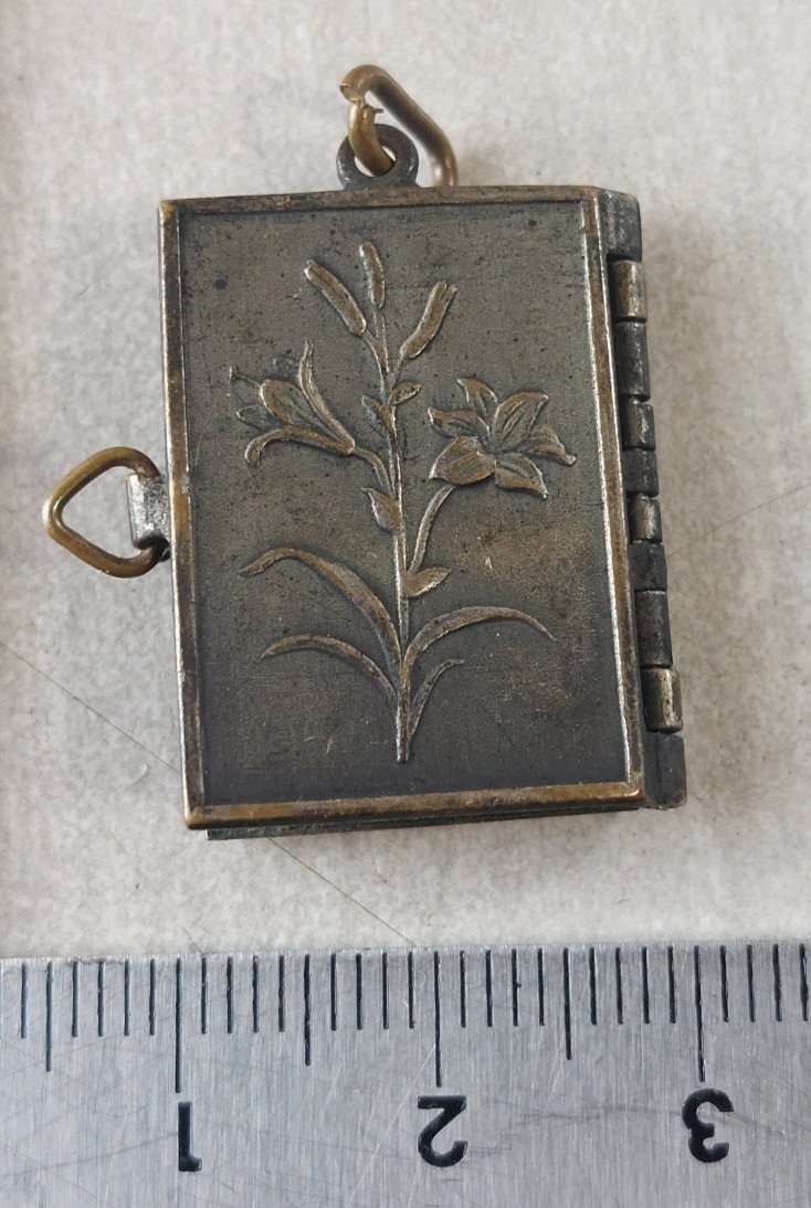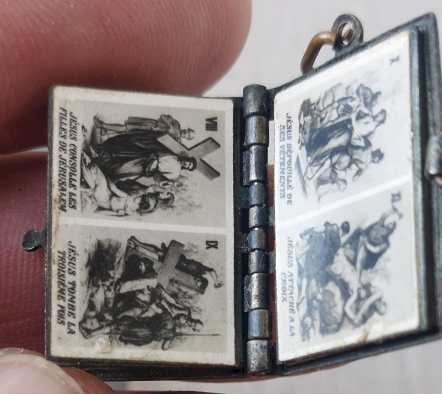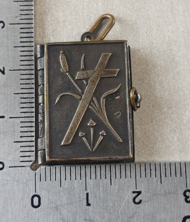 Antique small notebook / miniature religious book, pendant, in silver-plated metal in good condition, dimensions 2.4 cm X 1.9 cm, see photos. Check my other items! Reduced shipping costs for combined purchases. Condition: Used item with possible imperfections. Type: Christianity Material: Metal Country of origin: France