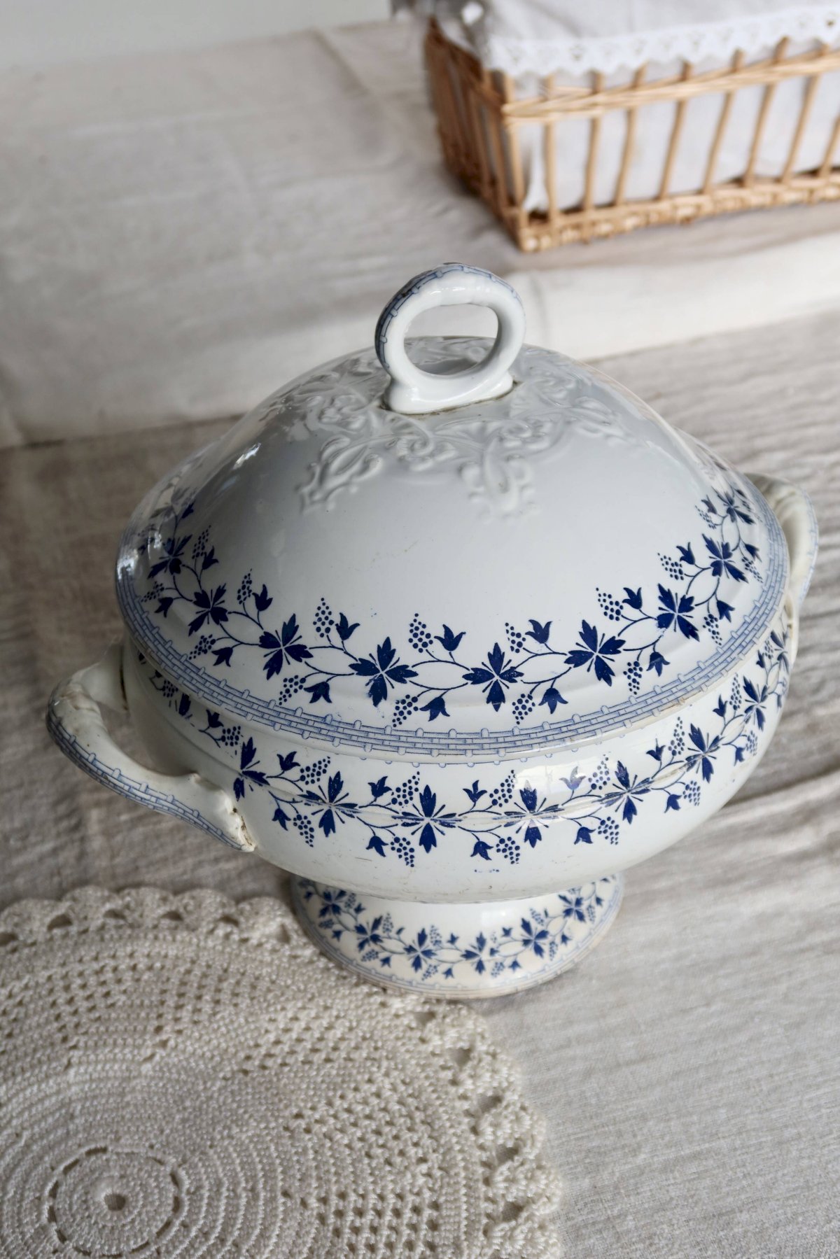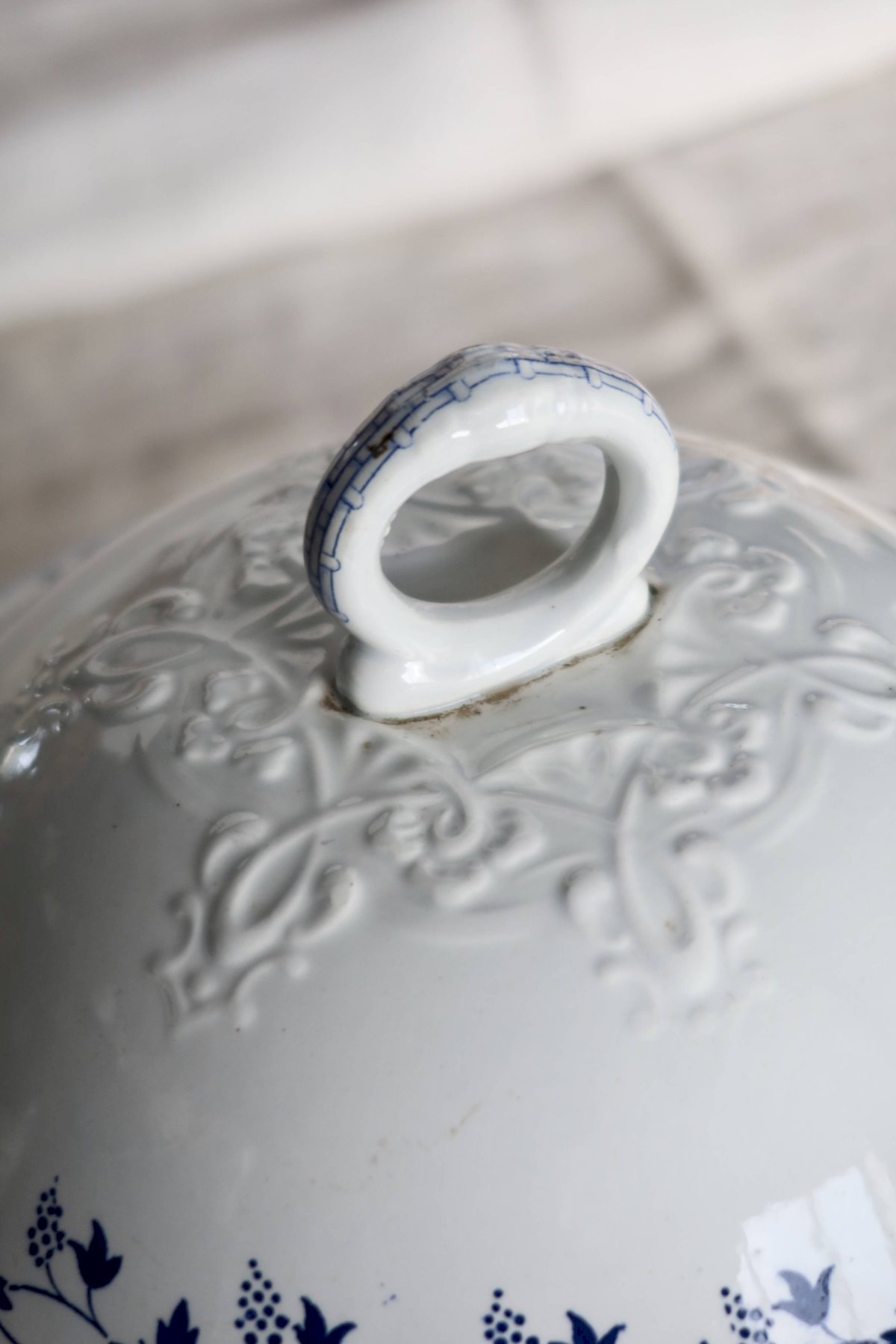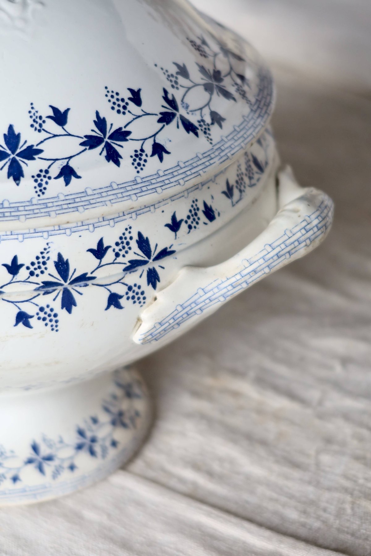 Beautiful antique soup tureen in earthenware from the Moulin des Loups manufactory, decorated with the delicate Blue Cornflower motif in blue on a white background.