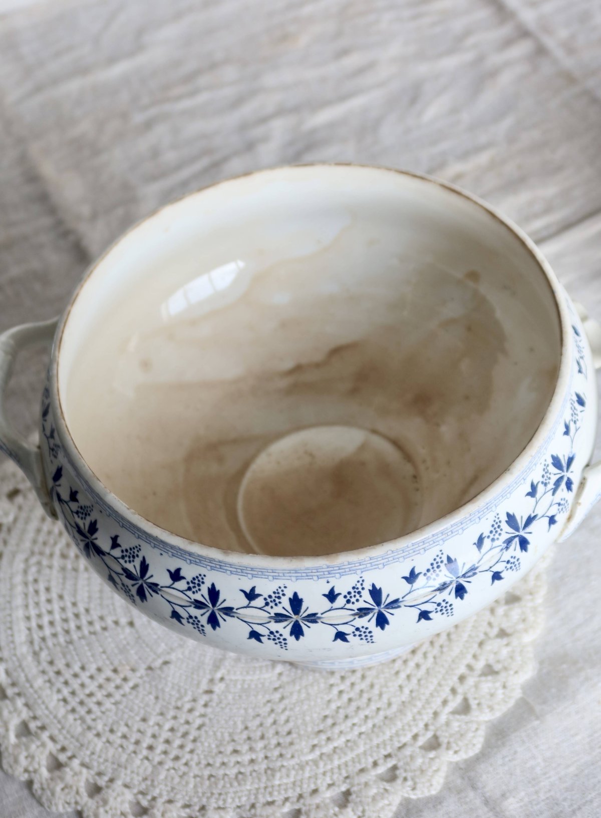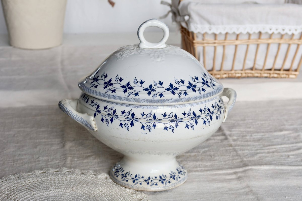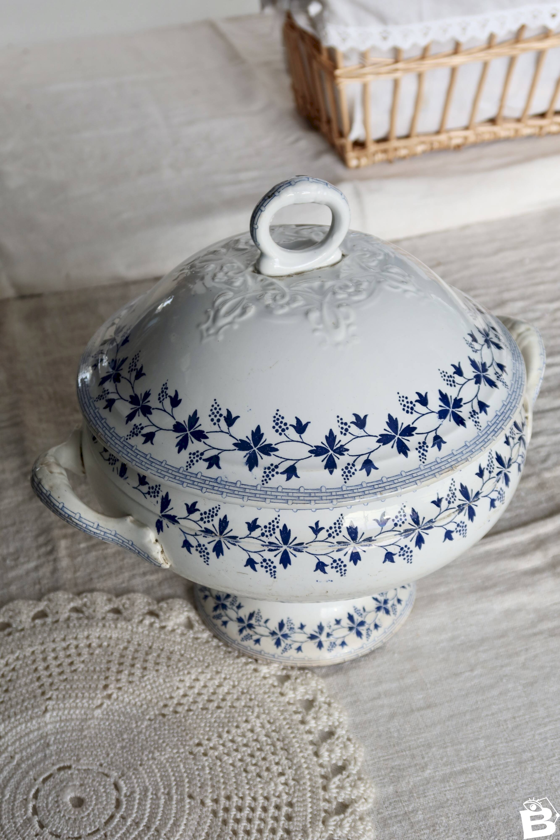 Beautiful antique soup tureen in earthenware from the Moulin des Loups manufactory, decorated with the delicate Blue Cornflower motif in blue on a white background.