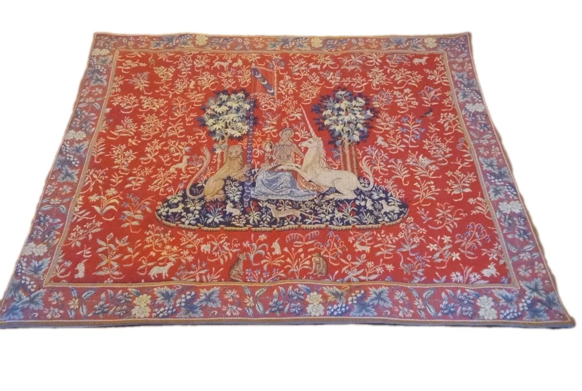 Old Tapestry from Halluin The View Designed, created, and woven in Halluin, France In this tapestry from the series "The Lady and the Unicorn," the Lady is sitting next to a lion, holding a mirror in one hand to allow the unicorn to admire itself. An oak and a holly frame this scene. Very nice Good condition Dimensions 96 cm x 111 cm Color: Multicolored Type: Tapestry Use: Apparel Origin: France Material: Damask