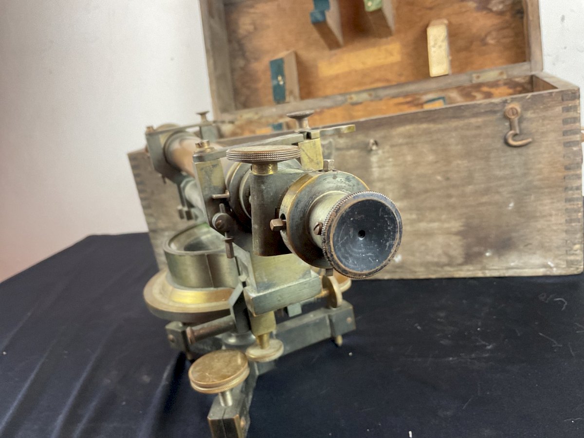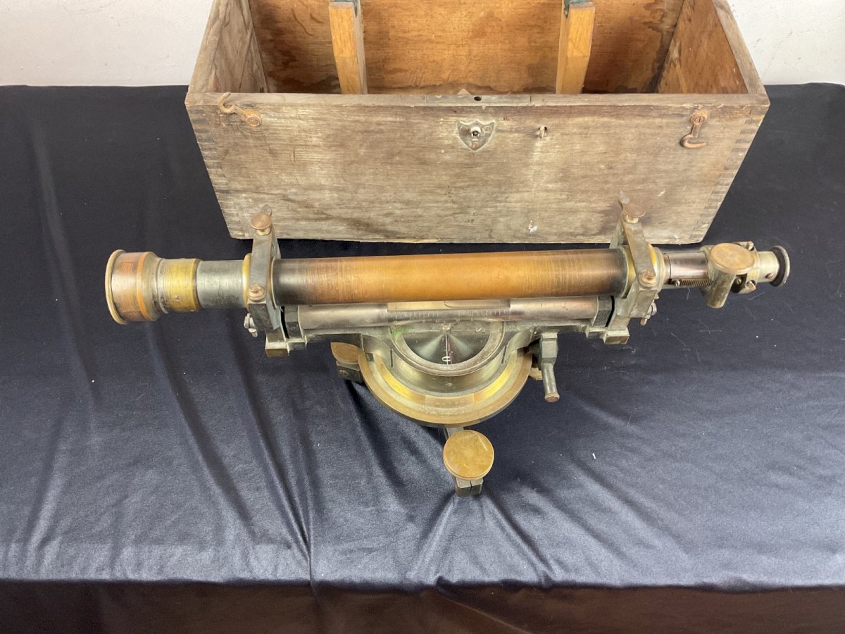 Old Theodolite Box with Level and Compass Condition: Used: Item that has been used. Please refer to the seller's description for more details... Used: Item that has been used. any possible imperfections. Era: 1900 - 1950 Type: Optical Subtype: Level Country of manufacture: France Material: Metal and brass