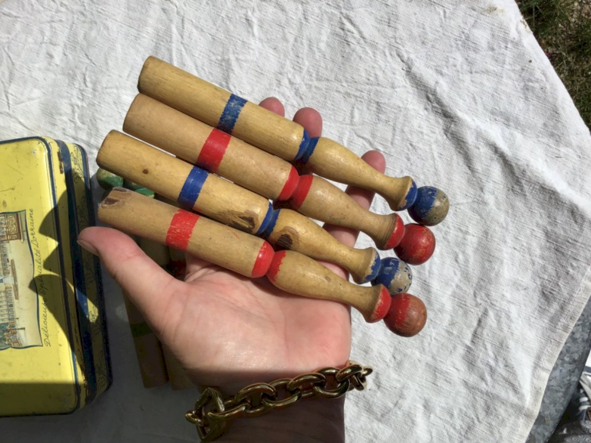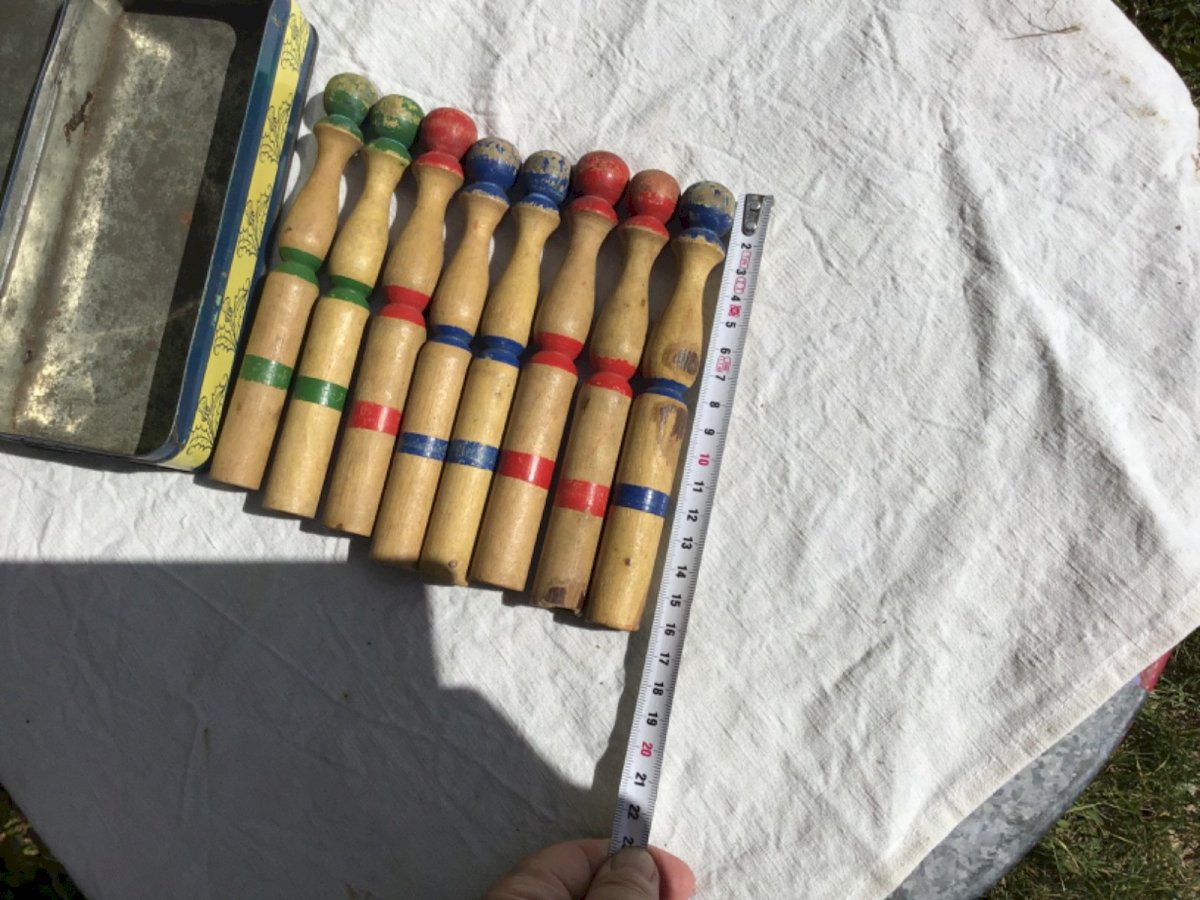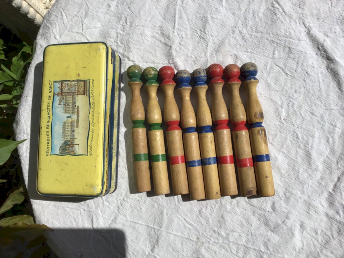 Small painted wooden skittles game 8 skittles Height 17 cm Pretty colors Sold in a tin bergamot box from Nancy Condition: Used Item has been used. possible imperfections. Vehicle/machine: no Type: Miniature Toys Imitation Game: no Material: Wood Miniature Toy: skittles game Board Game: no