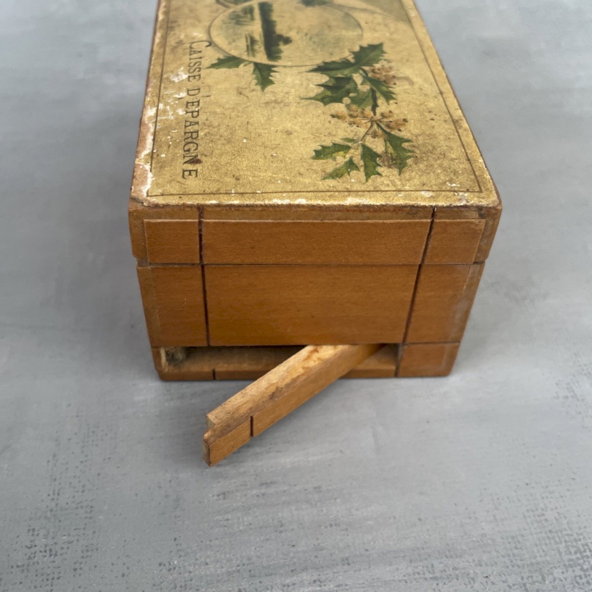 Antique wooden savings bank with a hidden mechanism Dimensions ~ 8.8 x 6 x 4.3 cm Weight ~ 60 g Good condition, in its original state, signs of time, see photos. Remember to group your purchases to reduce shipping costs! Condition: Used Item that has been used. Possible imperfections. Material: Wood Shape: Rectangular Country of origin: France