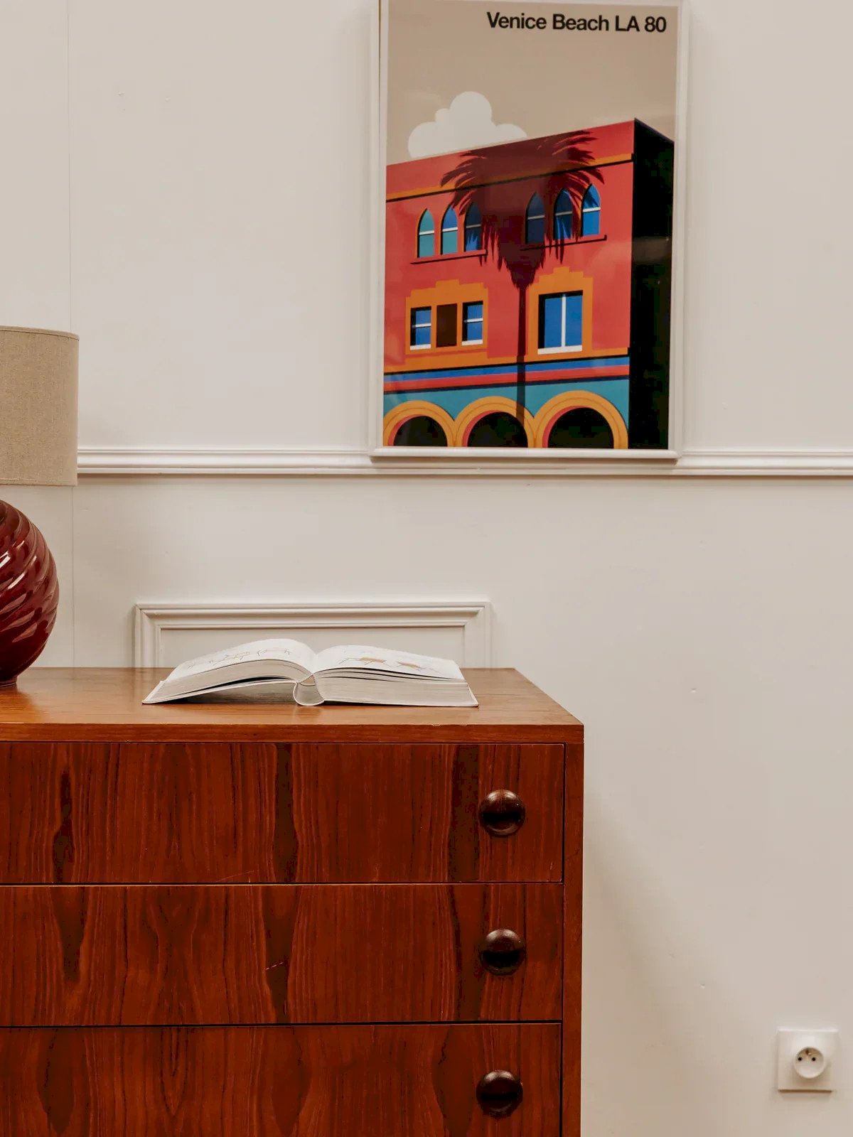 Adopt this Scandinavian chest of drawers with four dark wood drawers, featuring tapered legs that create an airy silhouette. The round handles emphasize its clean design while the beautiful wood grain adds a natural and authentic warmth. Its generous proportions offer practical storage for linen and clothing, and its wide surface is also suitable for displaying decorative objects. Ideal for adding a sober and timeless touch to the bedroom or entryway. Length: 85 cm Width: 60 cm Height: 83 cm Drawer height: 13 cm Condition: Used: Item has been used. Item shows some signs of superficial wear, fully operational and working correctly. It may be a demonstration model or an item returned to the store after a short period of use. possible imperfections. Brand: Debongout Type: Thrift product Material: Wood Style: Contemporary Custom: Dressers