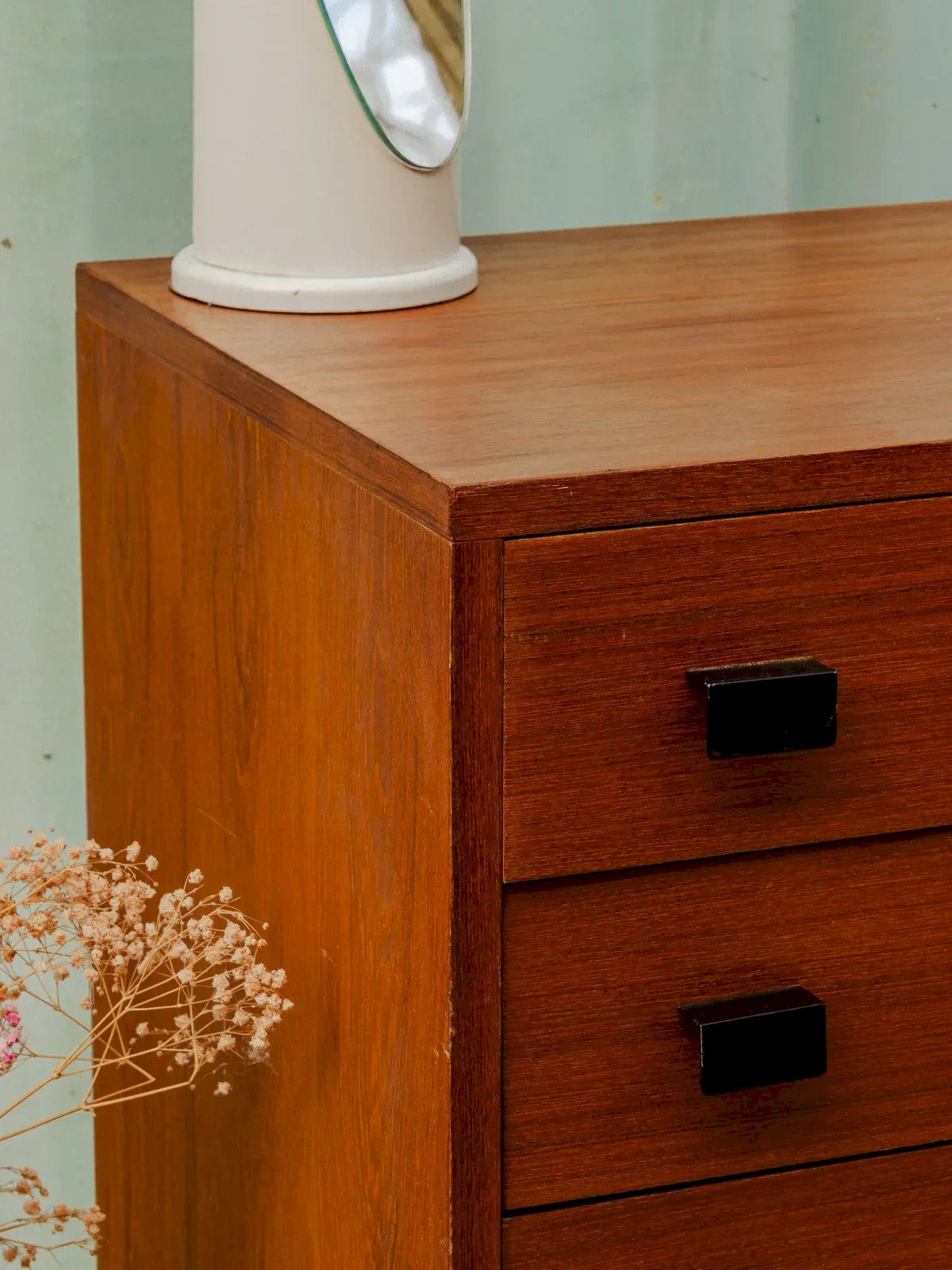 Add a contemporary and warm wooden chest of drawers, featuring four practical drawers to organize laundry and accessories. The black metal handles and legs, accented with golden circles, add an elegant graphic touch while the dark patina highlights a distinctive silhouette, ideal for an entrance or a bedroom. There are some signs of aging and a stain in the first drawer. Length: 87 cm Width: 44 cm Height: 74.5 cm Drawer height: 10 cm Condition: Used: Item that has been used. Item showing some signs of superficial wear, fully operational and functioning correctly. It may be a display model or an item returned to the store after a short period of use, including any imperfections. Brand: Debongout Type: Curated product Material: Wood, Metal Style: Contemporary Custom: Dressers