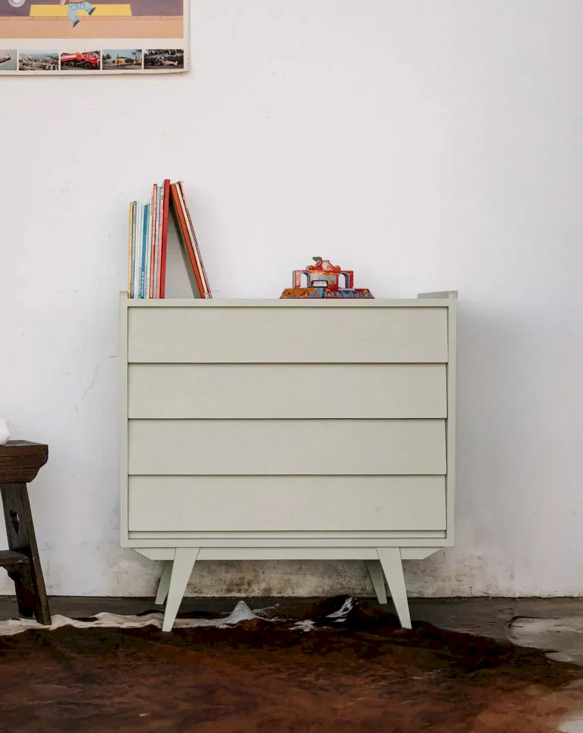 Discover this stunning French wooden dresser, elegantly designed with four grooved drawers in a soothing sea green. Although it shows some signs of use and wear, these imperfections do not detract from the charm and authentic character of this piece of furniture. Ideal for adding a vintage touch to your interior, this dresser combines aesthetics and functionality, perfect for organizing your belongings with style. Length: 85 cm Width: 45 cm Height: 87 cm Drawer height: 12 cm Condition: Secondhand: Item that has been used. Item showing some superficial signs of wear, fully operational and functioning correctly. It may be a demonstration model or an item returned to the store after a short period of use. Potential imperfections. Brand: Debongout Type: Thrifted product Material: Wood Style: Contemporary Custom: Dressers