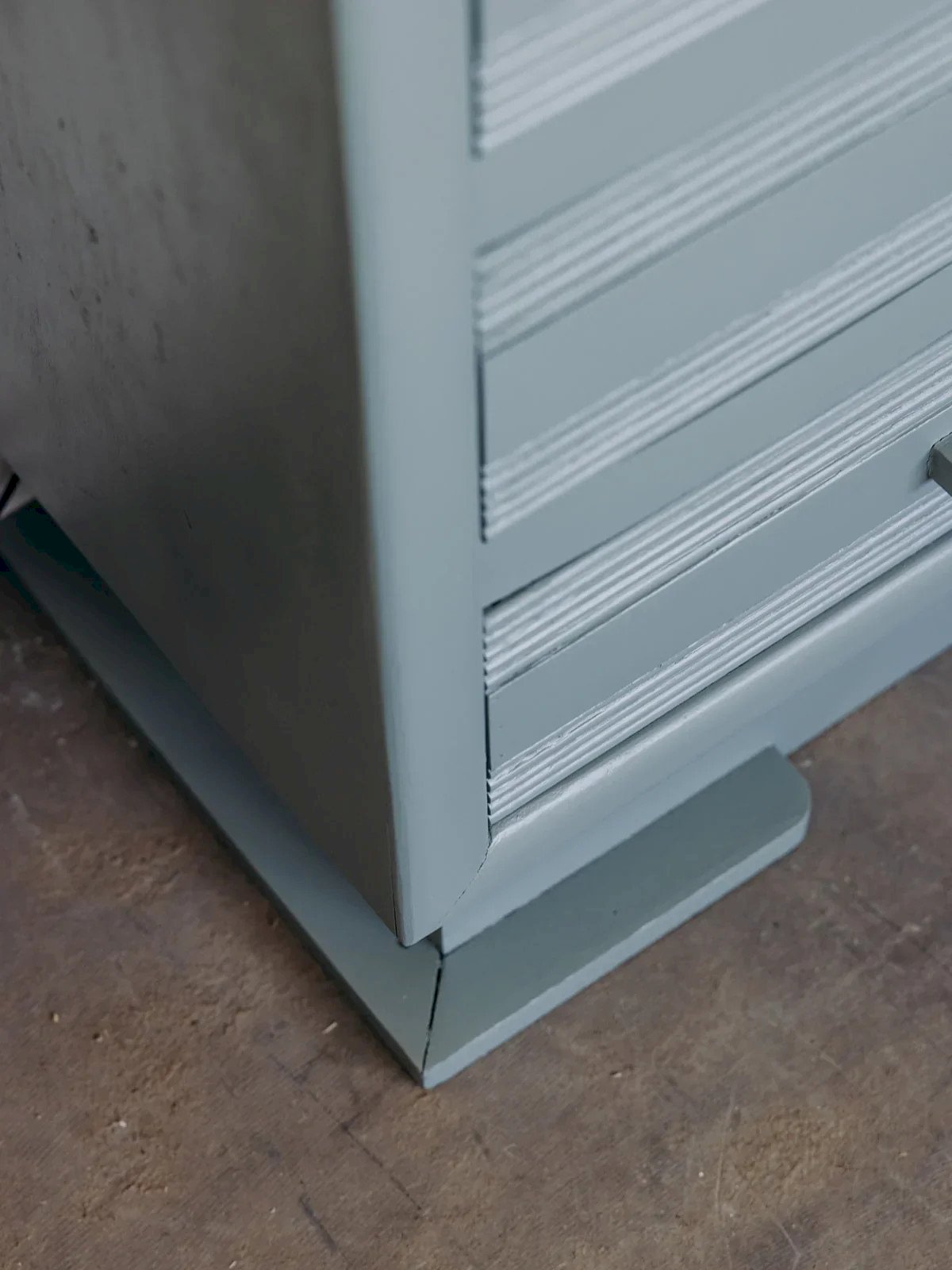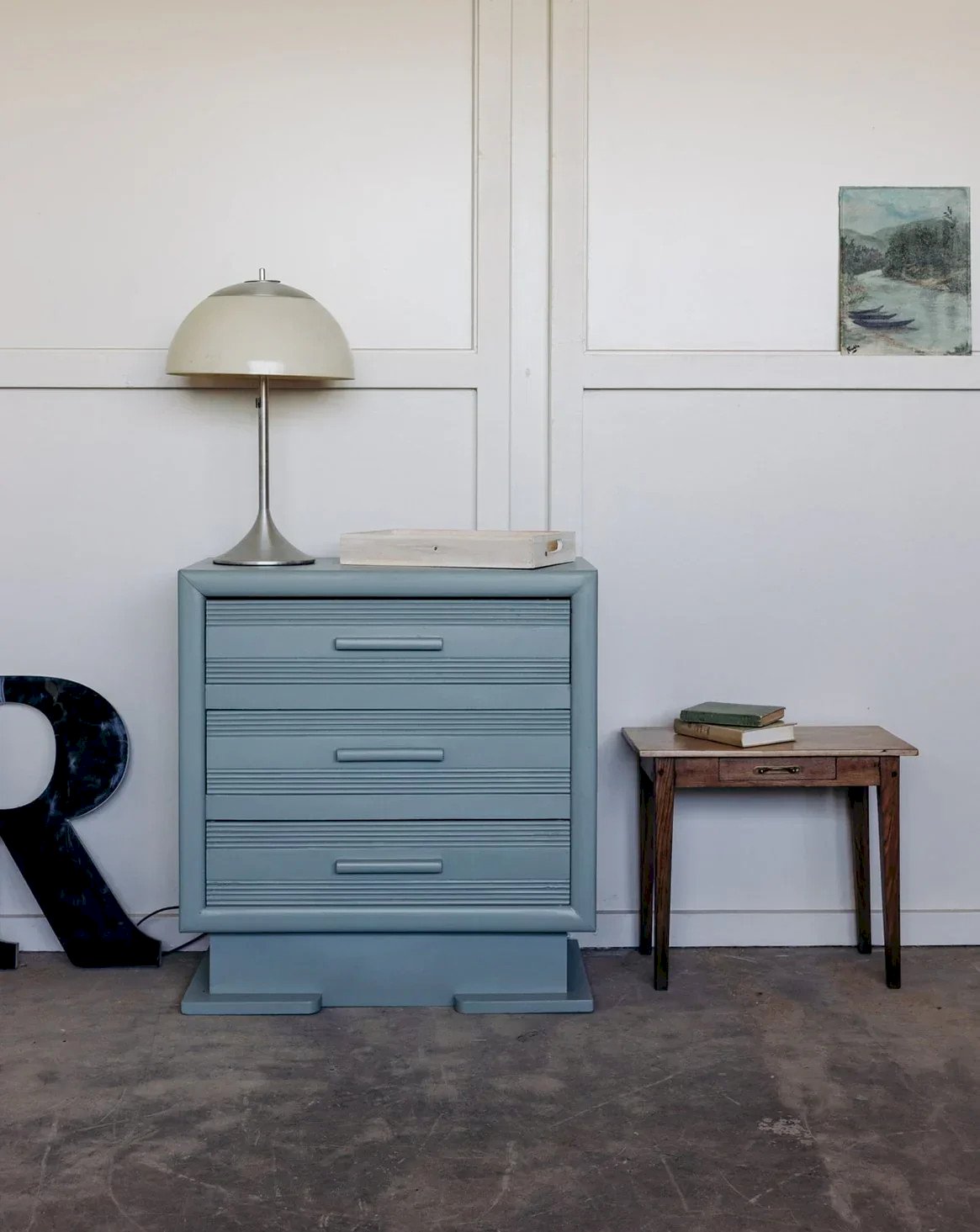 Add a retro touch to your interior with this vintage dresser painted in gray-green. It consists of three drawers adorned with fine stripes that give it character. The long handles accentuate its 60s style while being practical. The soft and original tone fits well in both a bedroom and an entryway. A functional piece of furniture with a delicately embraced charm. Dimensions: Length: 76 cm Height: 81 cm Depth: 41 cm Drawer dimensions: Length: 63 cm Height: 14 cm Depth: 34 cm Condition: Used: Item has been used. Item shows some signs of superficial wear, fully operational and functioning correctly. It may have been a display model or an item returned to the store after a short period of use. Possible imperfections. Brand: Debongout Type: Thrifted product Material: Wood Style: Contemporary Custom: Dressers