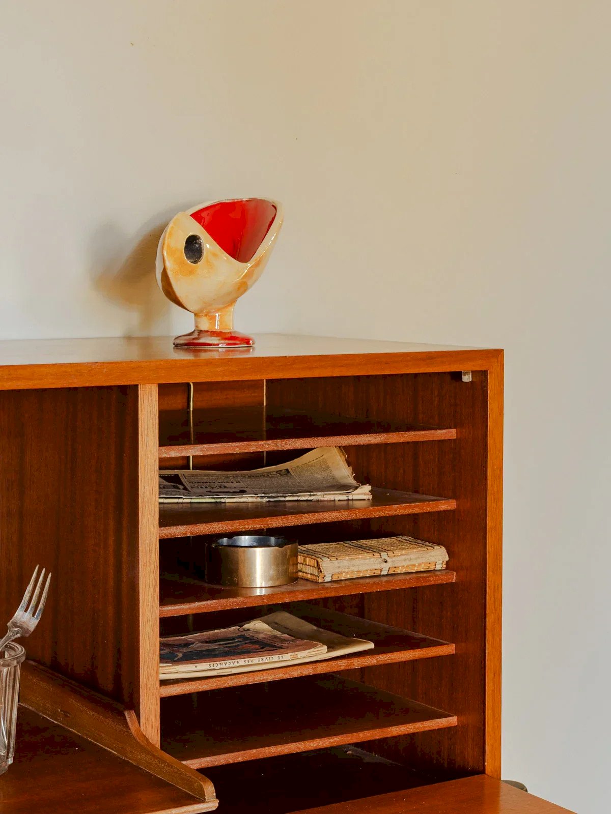 Discover this elegant 70s chest of drawers, made of teak, which will bring a vintage touch to your interior. It features a practical compartment equipped with a sliding tray, ideal for easy access to your essentials. Additionally, its other compartment has five cubbies, perfect for organizing your small items with style. With its wooden legs, this chest of drawers combines functionality and aesthetics, harmoniously fitting into all spaces. Length: 100 cm Width: 40 cm Height: 88 cm Seat height: 45 cm Condition: Used: Item that has been used. Item showing some superficial signs of wear, fully operational and functioning correctly. It may be a demonstration model or an item returned to the store after a short period of use, with possible imperfections. Brand: Debongout Type: Vintage product Material: Teak Style: Contemporary Customizable: Chests of drawers.
