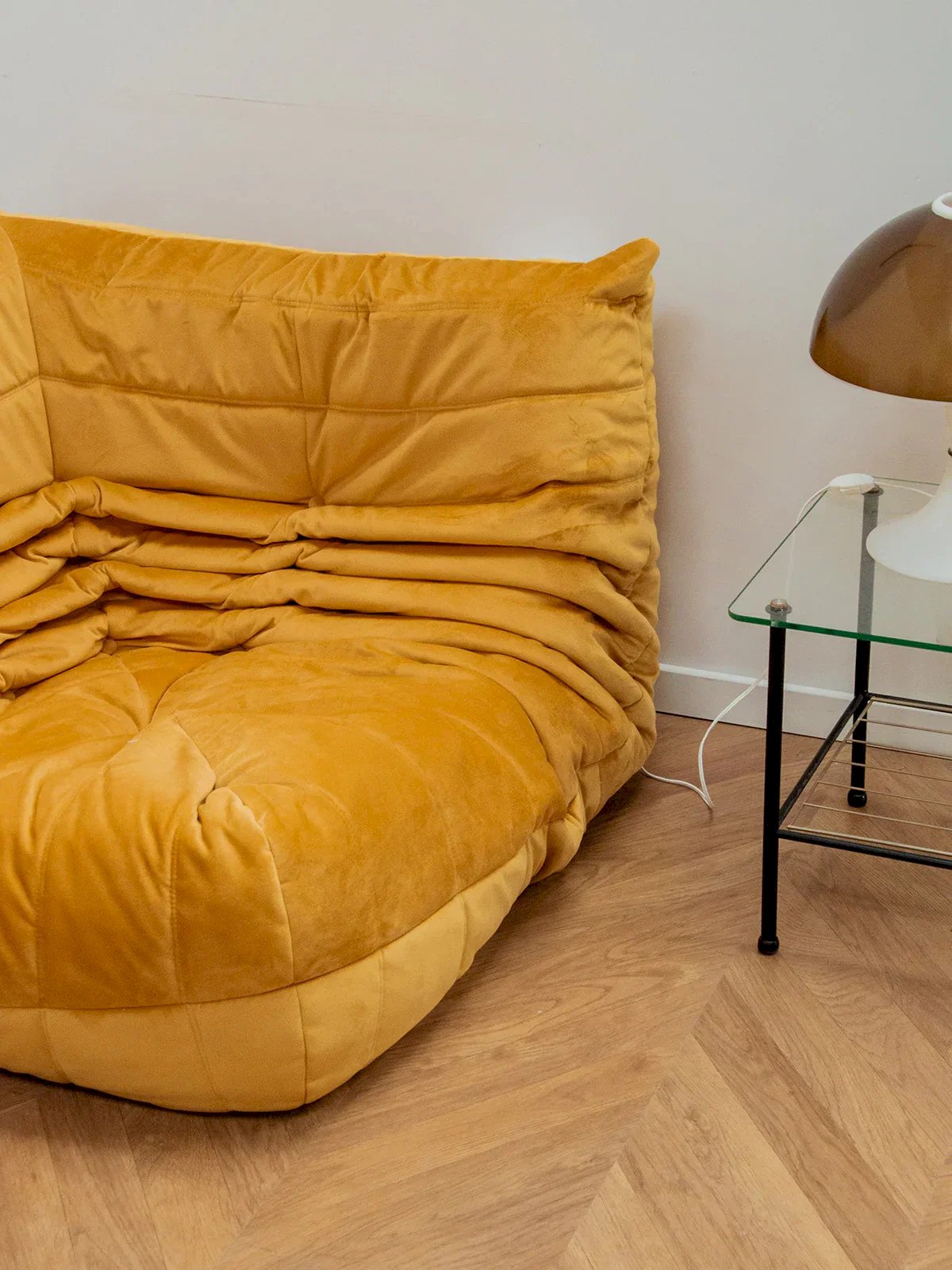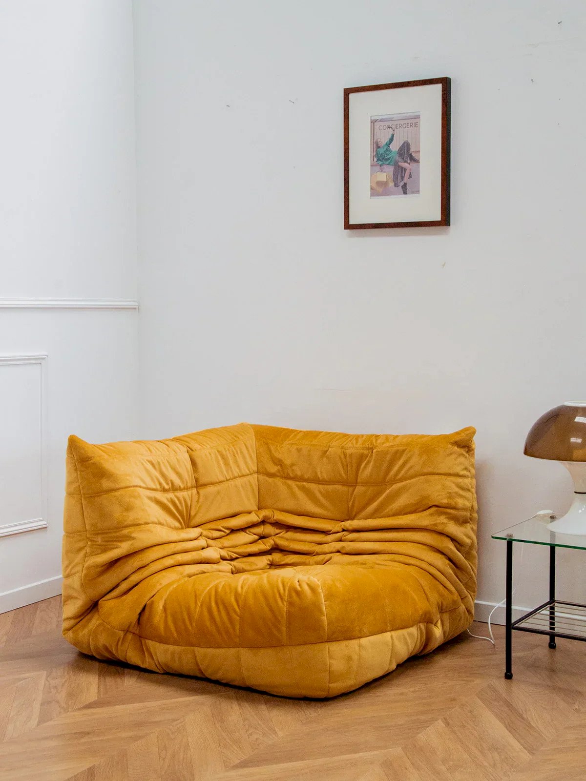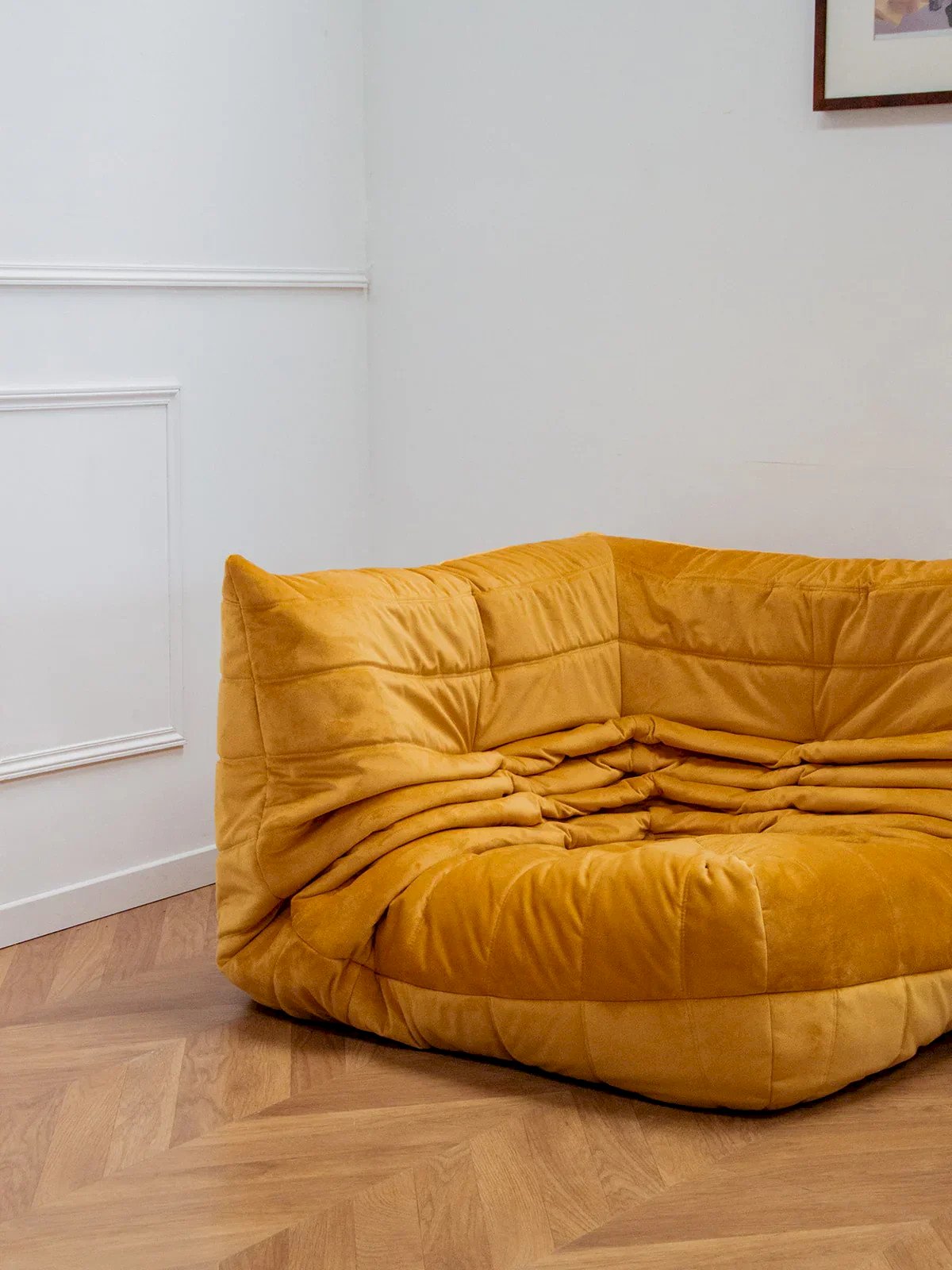 The corner Togo, designed by Michel Ducaroy, is a centerpiece of contemporary French design that combines comfort and style. Its generous foam structure offers unparalleled comfort, while its bright yellow color infuses a warm atmosphere into your interior. Restyled, this model embodies the perfect harmony between aesthetics and functionality, elegantly integrating into various living spaces. Ideal for those seeking a modern and pleasant seating option, the corner Togo is sure to appeal to design enthusiasts. Length: 102 cm Height: 70 cm Depth: 102 cm Seat height: 35 cm Condition: Used: Item has been used. Item shows some signs of superficial wear, ...Used: Item has been used. Item shows some signs of superficial wear, fully operational and functioning correctly. It may be a demonstration model or an item returned to the store after a short period of use. Any imperfections. Color: Multicolor Height: Fabric Width: Armchairs and lounge chairs Brand: Debongout Type: Vintage product Material: Fabric Style: Contemporary