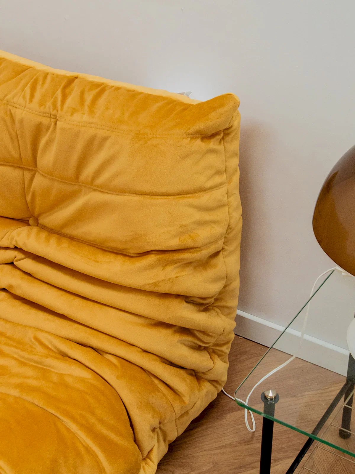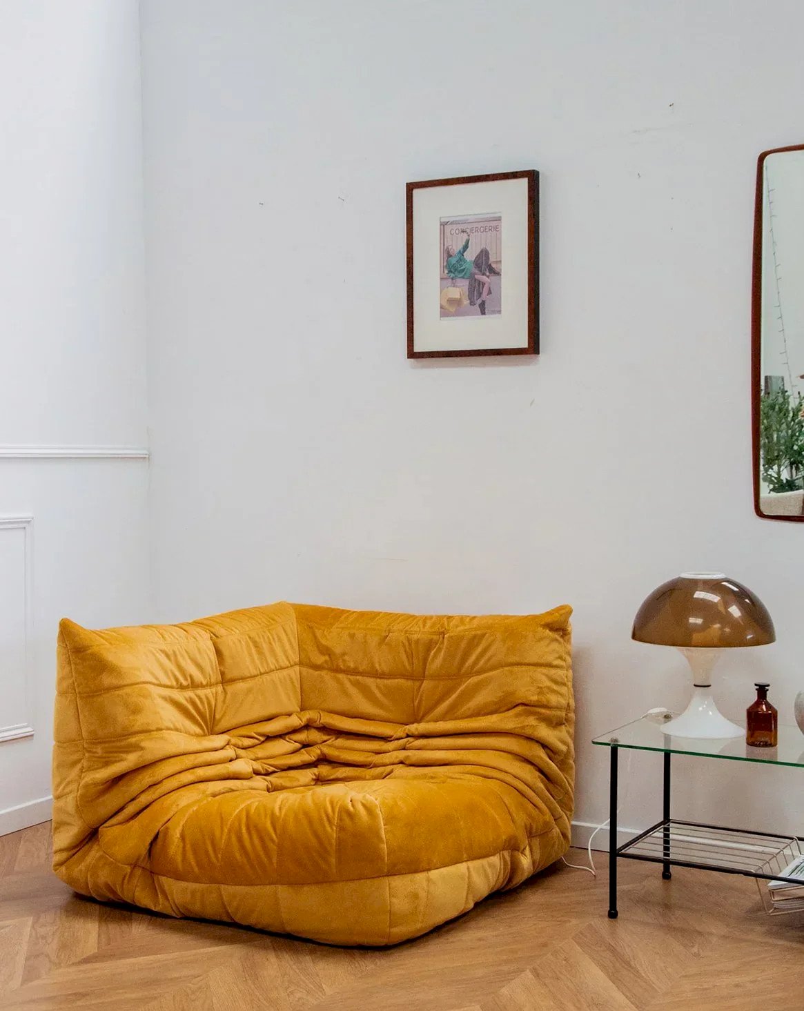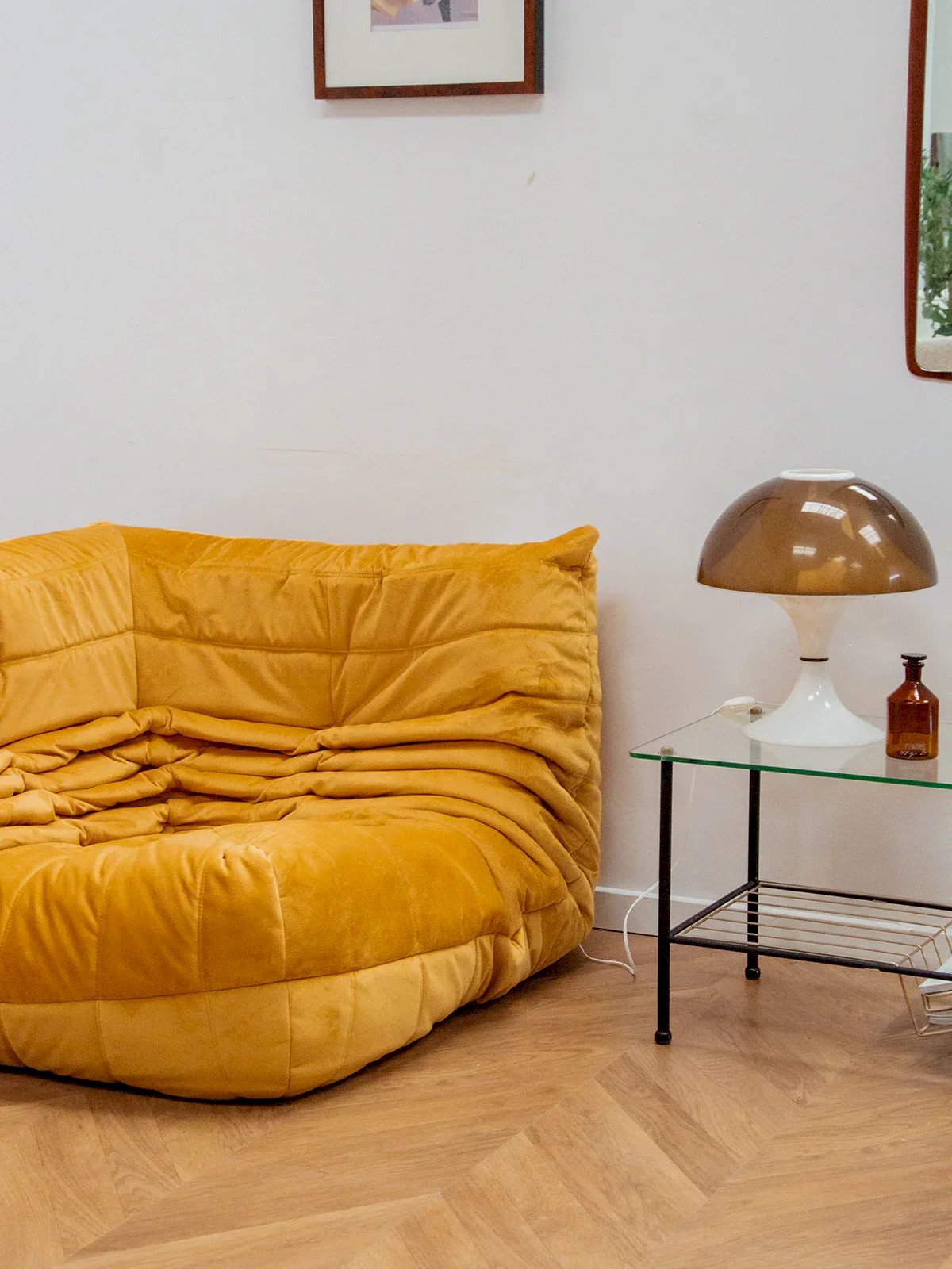 The corner Togo, designed by Michel Ducaroy, is a centerpiece of contemporary French design that combines comfort and style. Its generous foam structure offers unparalleled comfort, while its bright yellow color infuses a warm atmosphere into your interior. Restyled, this model embodies the perfect harmony between aesthetics and functionality, elegantly integrating into various living spaces. Ideal for those seeking a modern and pleasant seating option, the corner Togo is sure to appeal to design enthusiasts. Length: 102 cm Height: 70 cm Depth: 102 cm Seat height: 35 cm Condition: Used: Item has been used. Item shows some signs of superficial wear, ...Used: Item has been used. Item shows some signs of superficial wear, fully operational and functioning correctly. It may be a demonstration model or an item returned to the store after a short period of use. Any imperfections. Color: Multicolor Height: Fabric Width: Armchairs and lounge chairs Brand: Debongout Type: Vintage product Material: Fabric Style: Contemporary