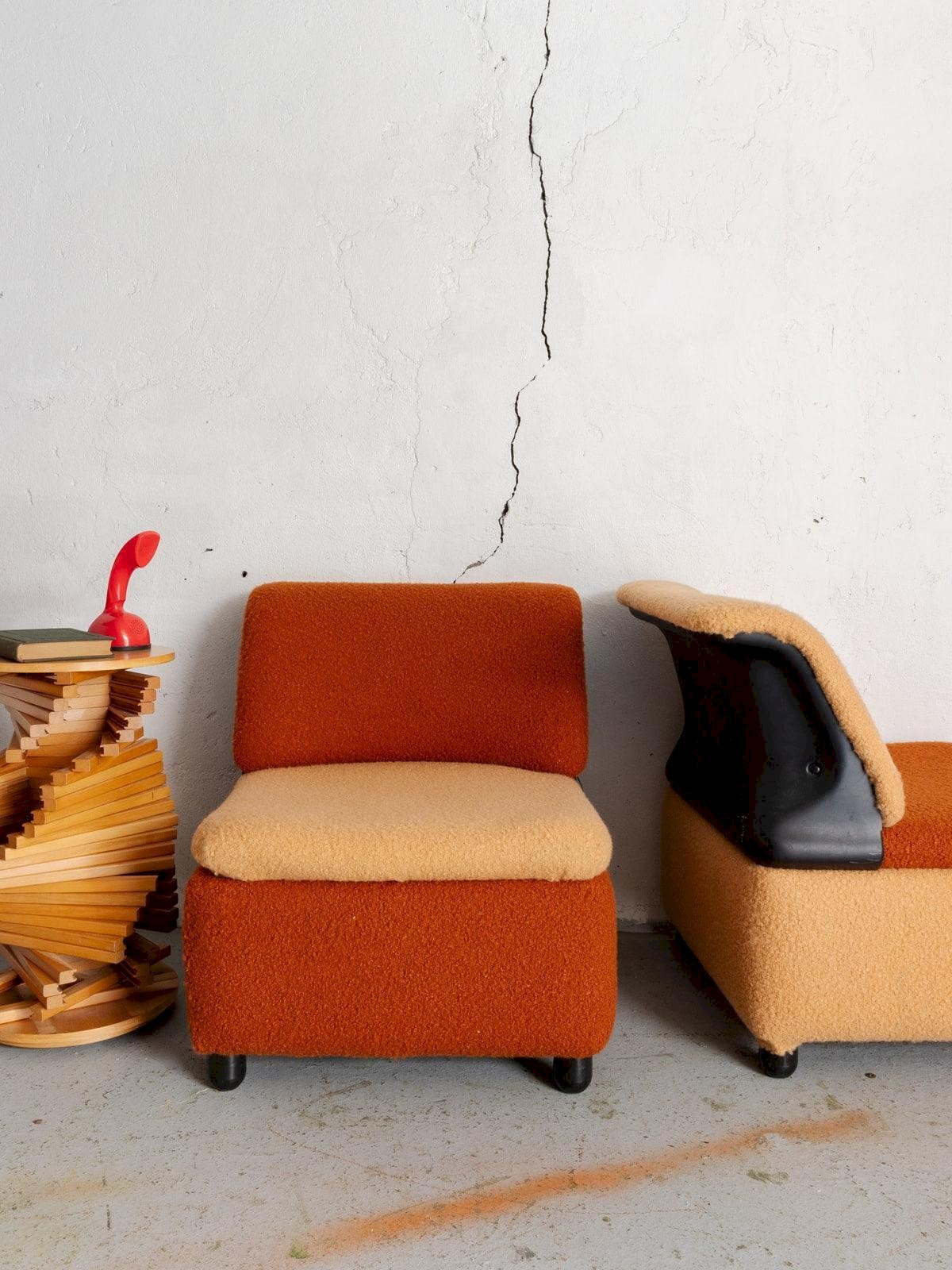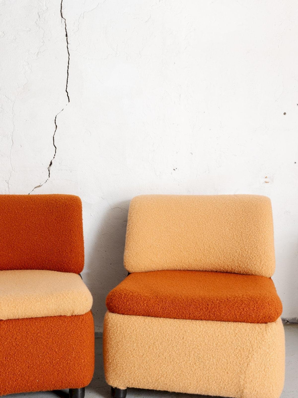 Bring a retro touch to your home with this pair of two-tone armchairs from the 70s, completely refurbished. Upholstered in a wool boucle fabric with orange and beige hues, they stand out for their soft and elegant vintage lines. The black plastic insert on the back of the backrest adds a contemporary note that perfectly complements the round black legs. With their comfortable seating, these armchairs are ideal for creating a cozy corner in a bedroom or as chairs in a living room. Both seats are available and sold together. Online exclusive, the meeting will take place at your home! Length: 64 cm Width: 63 cm Height: 74 cm Seat height: 42 cm Depth: 51 cm Condition: Used: Item that has been used. The item shows some superficial signs of wear... Used: Item that has been used. The item shows some superficial signs of wear, fully operational and functioning correctly. It may be a demonstration model or a product returned to the store after a short period of use, with possible imperfections. Color: Multicolor Height: Wool, Plastic Width: Armchairs and lounge chairs Brand: Debongout Type: Vintage product Material: Wool, Plastic Style: Contemporary
