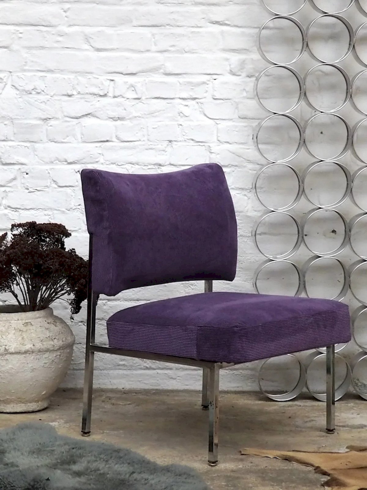 Adopt this 70s armchair, refurbished in violet corduroy that highlights its volumes and retro-chic look. The chrome aluminum base adds a graphic and lightweight note, while the welcoming seat and compact format make it an ideal accent chair for a reading nook or an elegant bedroom. Some signs of wear on the chrome. Width: 57 cm Height: 76 cm Seat height: 42 cm Depth: 57 cm Seat depth: 45 cm Condition: Used: An item that has been used. Item showing some superficial signs of wear, ...Used: An item that has been used. Item showing some superficial signs of wear, fully operational and functioning correctly. It may be a demonstration model or an item returned to the store after a short period of use. Any imperfections. Color: Multicolor Height: Velvet, Steel Width: Armchairs and lounge chairs Brand: Debongout Type: Vintage product Material: Velvet, Steel Style: Contemporary
