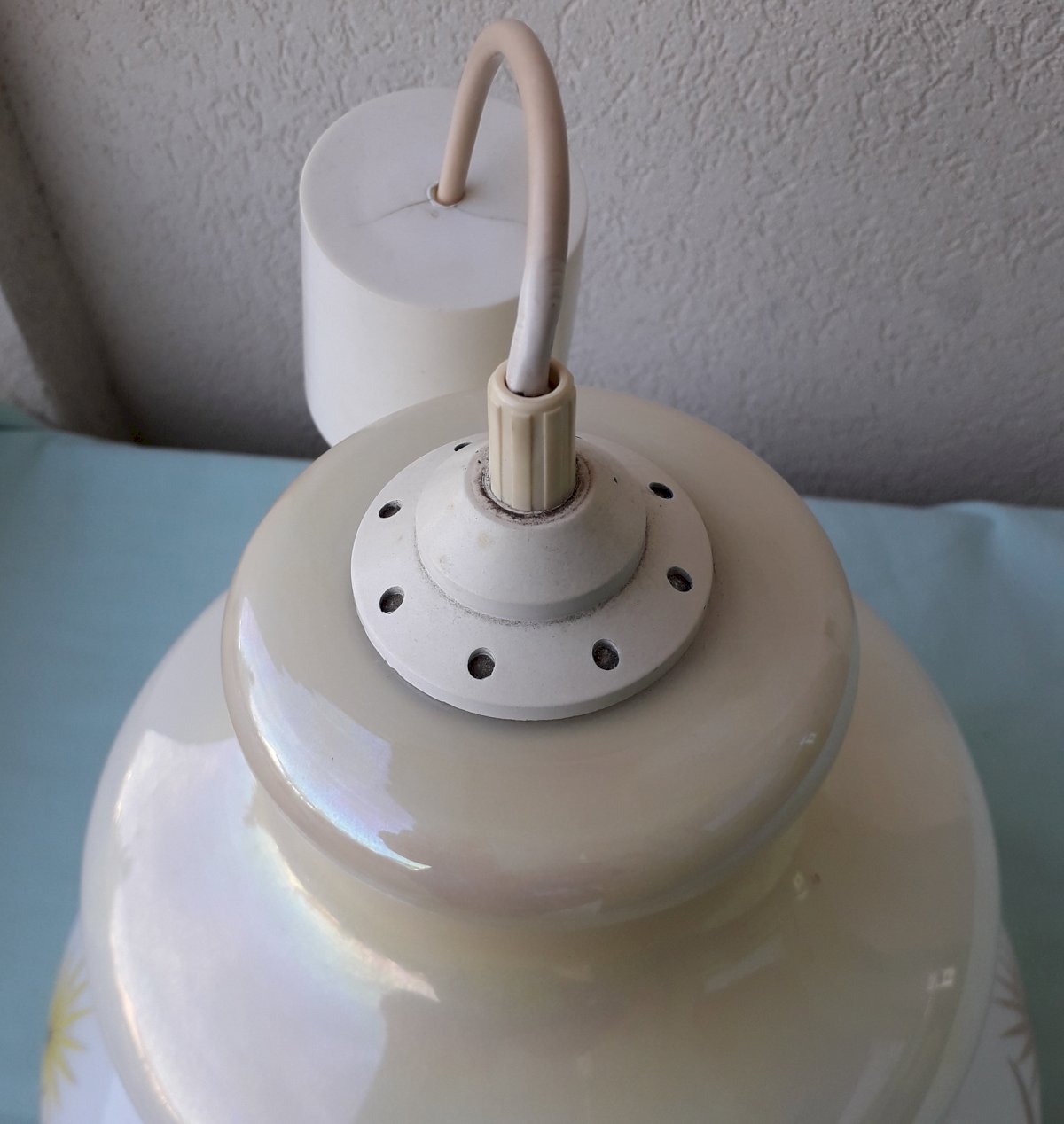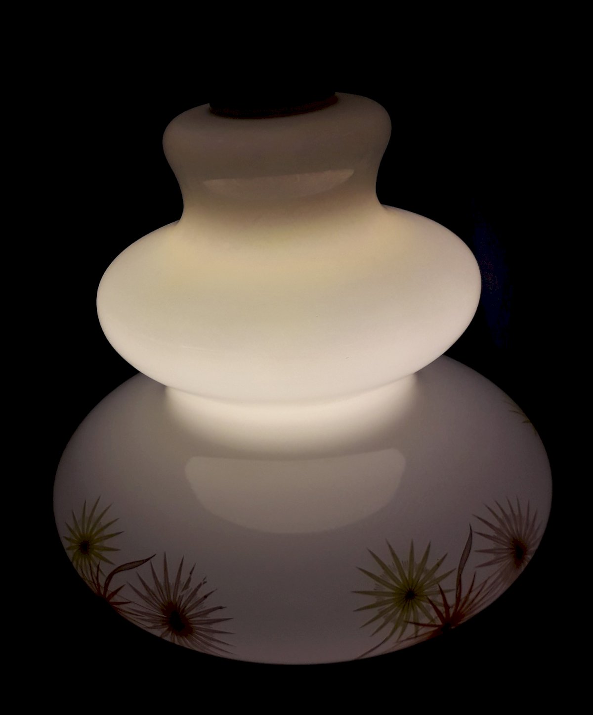 70s/80s opaline suspension with a stylized flower design. Very good overall condition, the plastics are yellowed and worn, vintage electricity is functional. Dimensions: total height 53 cm, maximum diameter 27 cm. Weight 1 kg. Feel free to contact me for any additional information and/or to make your offers. See my other items for sale.