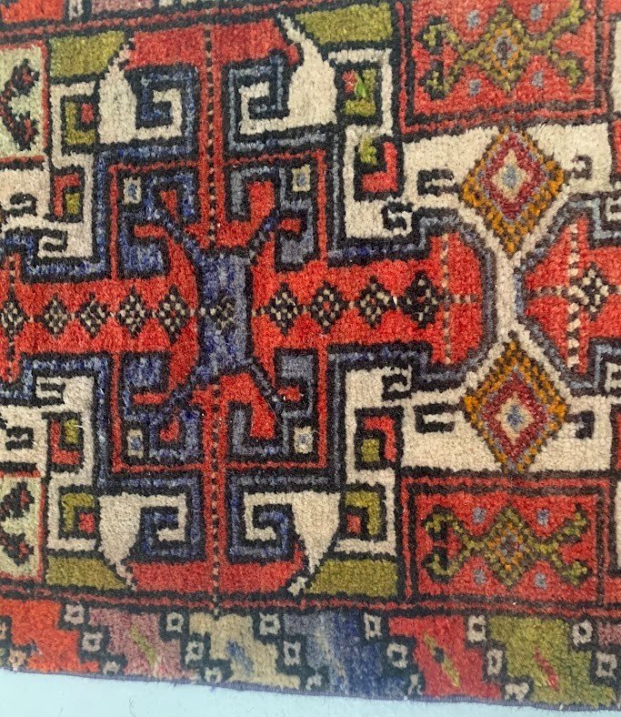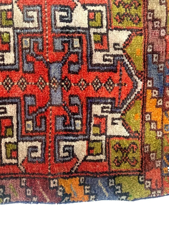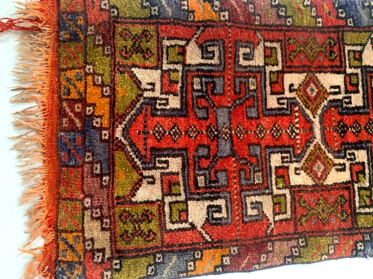 Small vintage wool rugs with geometric pattern. Used condition, see photos. Dimensions H 105 x W 45 cm. 20th century period: 20th-century design. Dominant color: Multicolor. Dominant material: Wool. Height: 109. Style: Geometric patterns. Width: 45. Shape: Rectangle.