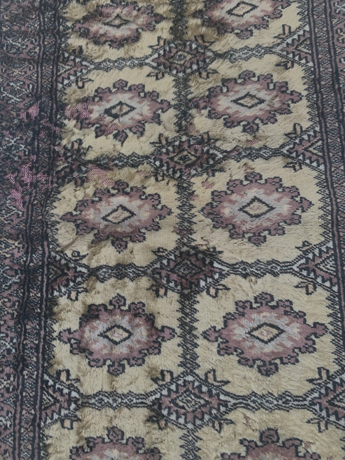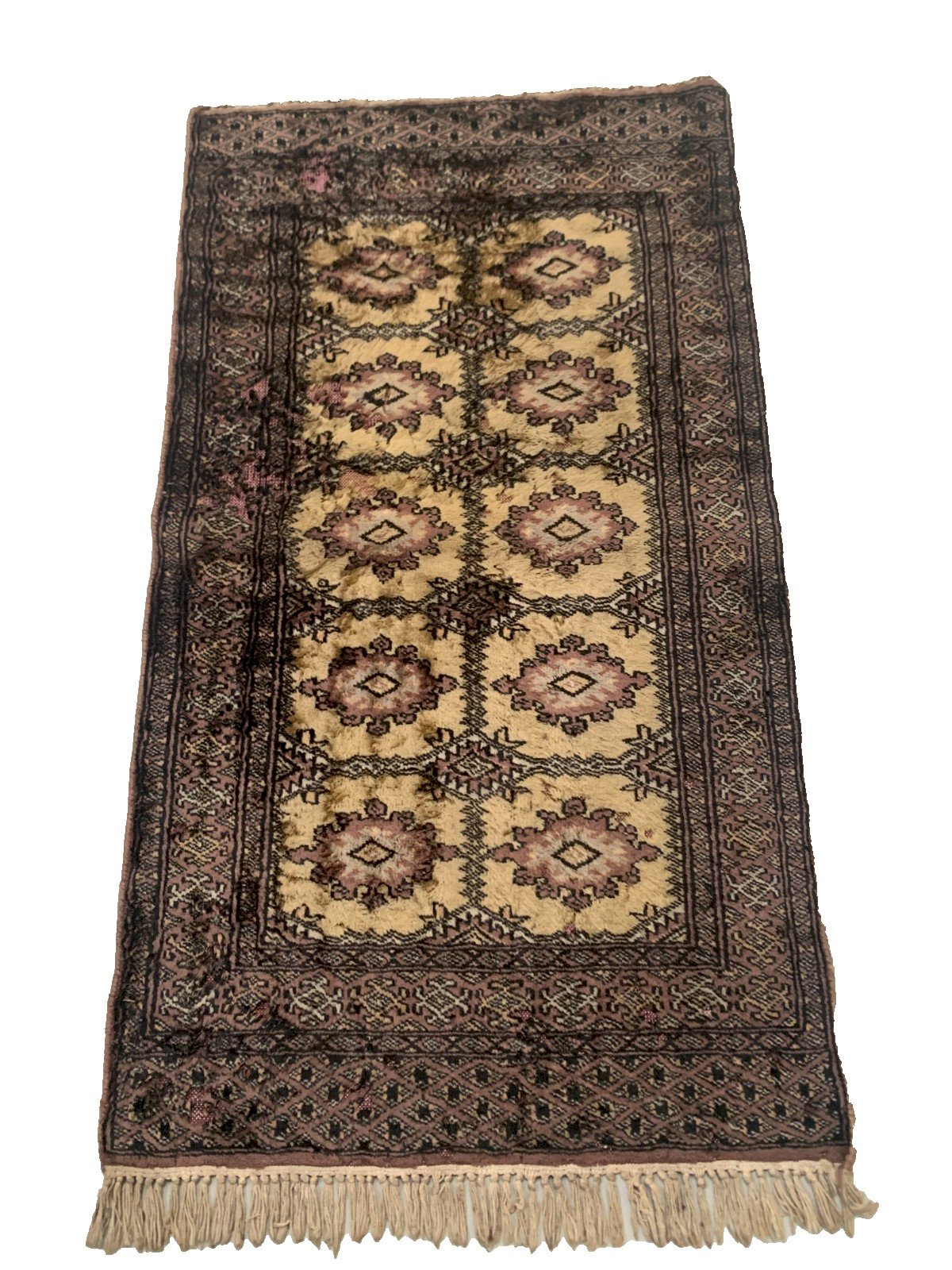 Small Wool Carpet Geometric Design Bears an old label "Imported Wool Carpet Pakistan" (wear from use). 20th century. Dimension L 104 cm X 59 cm Period: 20th Century Country of origin: Pakistan Dominant color: Multicolor Dominant material: Wool Style: Oriental, Persian