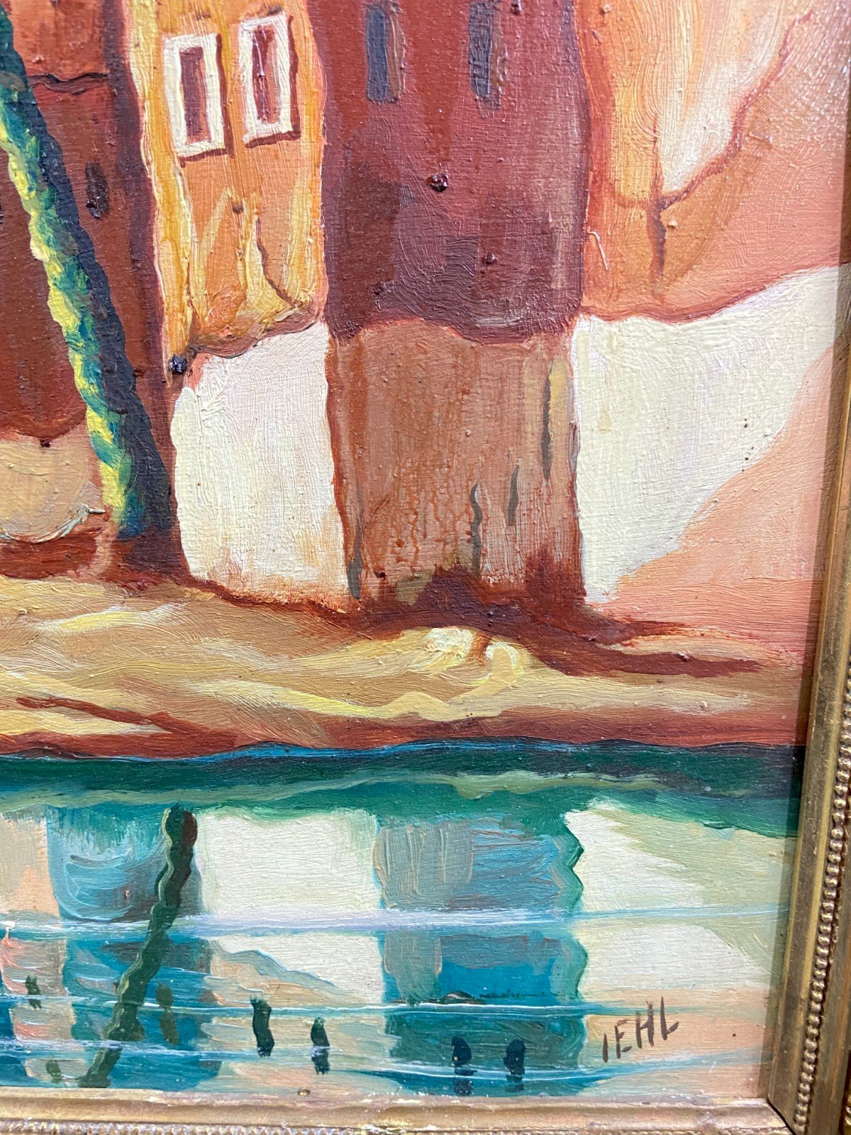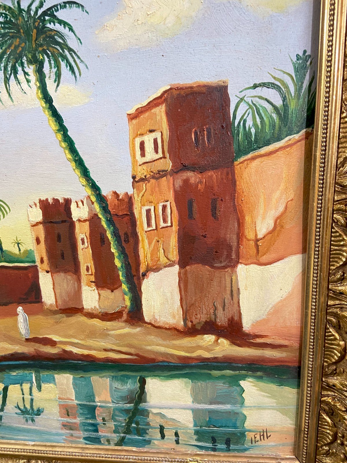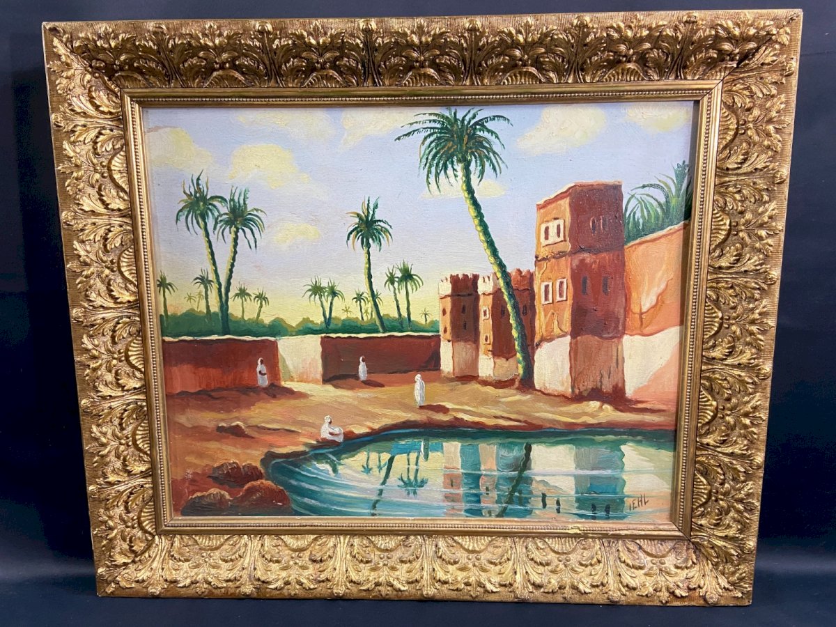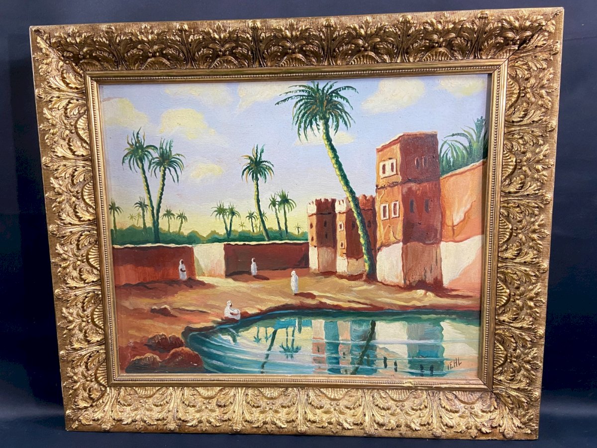 Orientalist painting, oil on panel 1950-1970 depicting a lively view of an oasis with palm trees in southern Morocco Maximum dimensions with frame: 74 x 62.3 cm / Dimensions of the view only 58.5 x 46.8 cm Total weight: 3511 grams Work signed IEHL in very good condition Frame in gilded wood and plaster with some subtle losses Ultra-secure shipping worldwide - Order pickup possible by appointment at 7 rue Notre-Dame 18000 Bourges. - Possibility of grouping within the same package: please contact me beforehand so that I can calculate your optimized shipping costs. Type: Oil Country of origin: Morocco Style: 1940-1960 Genre: Orientalism Features: Framed Theme: Countries of the world, Travel