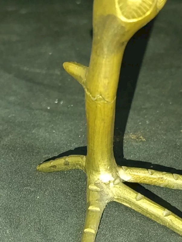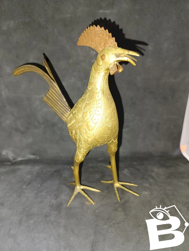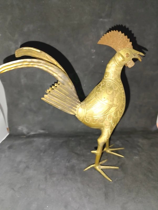 Original brass rooster from India or the East in good condition. It seems to have had a small restoration on the foot or maybe it's original, and there is a minor issue with one leg (a crack in the material) but it does not affect it at all. Height 23 cm.