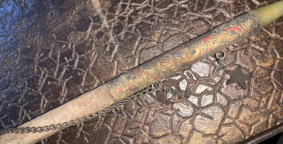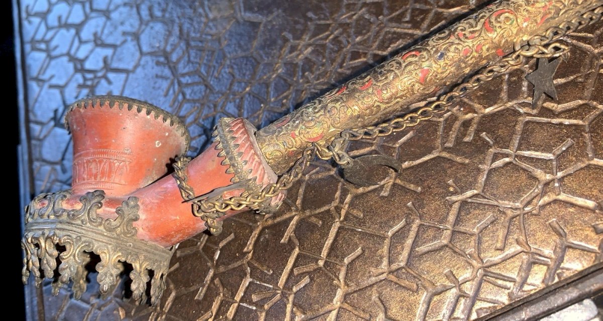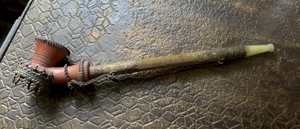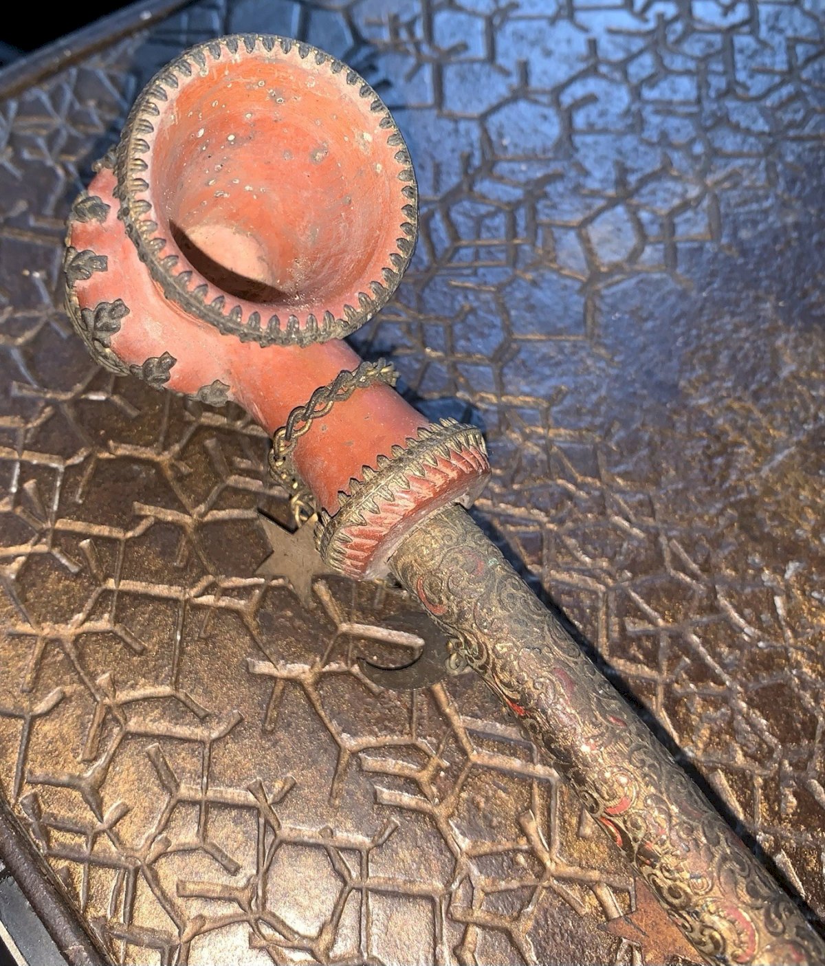 Grand Ottoman chibouk Glazed terracotta bowl tophane UV Fluorescence, Pipe (tip) in glass, ouraline or amber, Golden brass fittings, Pipe stem covered with velvet and gold-plated and enameled brass plaques with chiseled plant decoration, Period late 19th early 20th century, Mark Dorgest Constantinople, No breakage, Antique condition, Mount under the bowl slightly deformed, gilding a bit worn, Length: 40cm, Condition: Used, Item has been used. Any imperfections. Epoch: Antique (before 1900), Type: pipe, Brand: Dorgest Constantinople, Country of manufacture: Turkey, Material: Terracotta, Style: Carved, Engraved.