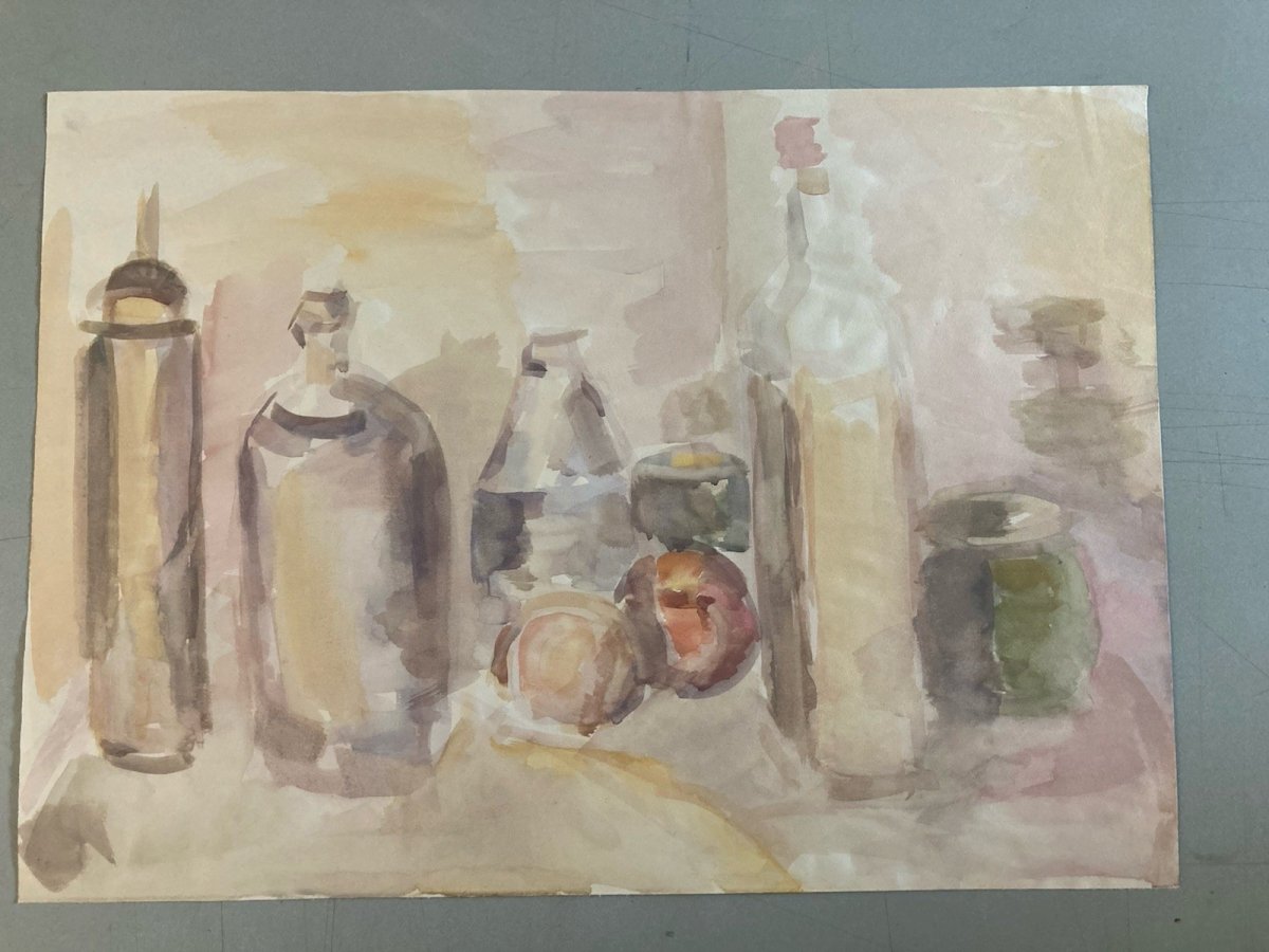 Painting 1970 Gouache Paper Post-Expressionist Still Life Bottle
