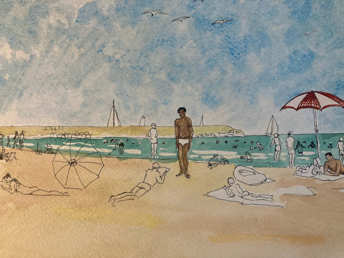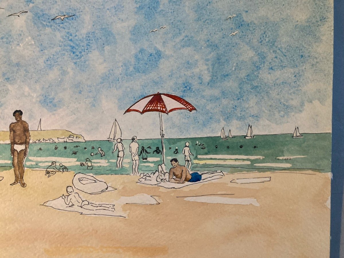 painting 1970 Gouache Paper Sea Beach To Identify Ocean Swimmer Art