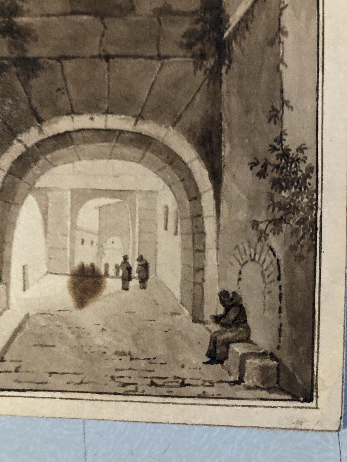 Drawing, in ink, representing the interior of a monastery, presumably the Grande Chartreuse as it was with other drawings of this place. Notable is a stain on the drawing, see photo. Type: Ink Country of origin: France Theme: Architecture