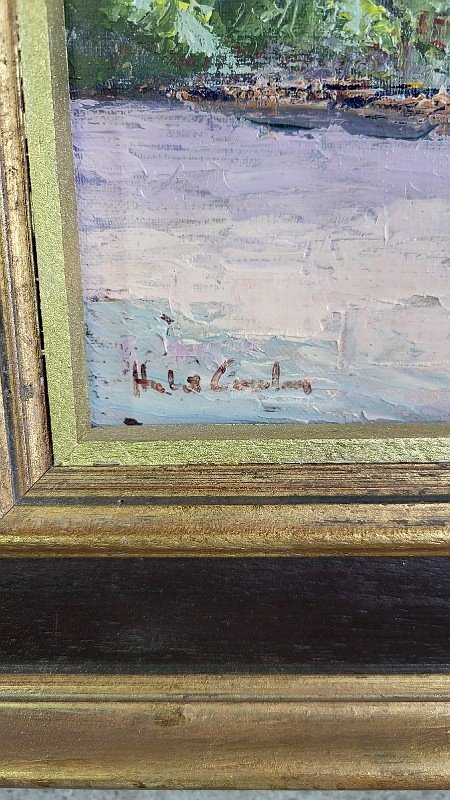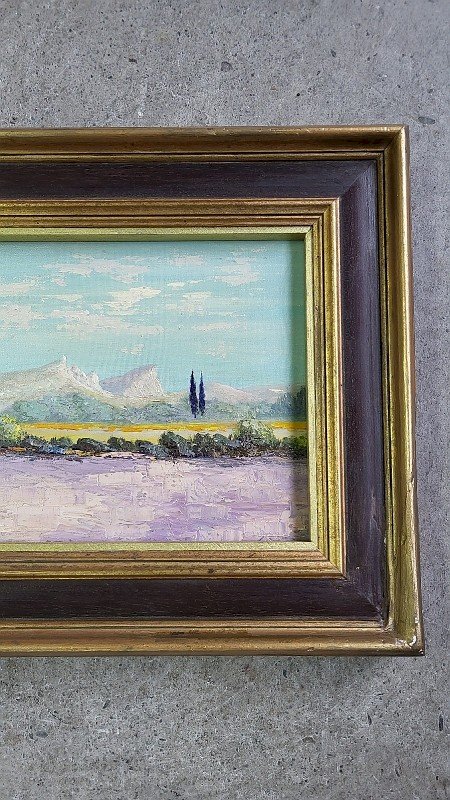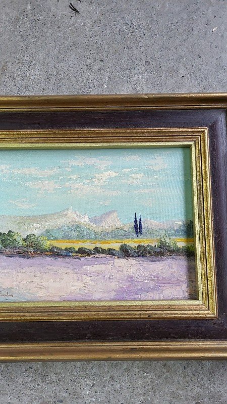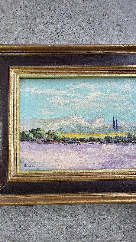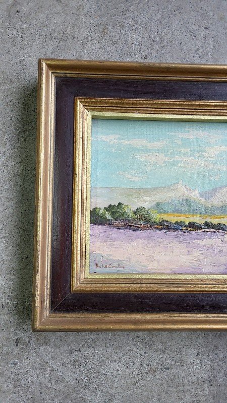 superb oil painting on canvas depicting a beautiful view of Pic Saint Loup, signed by Hubert Coulon from Lunel, known in the Montpellier region. It is a very nice piece. The frame measures 46 cm wide by 37 cm high, and the painting measures 33 cm wide by 24 cm high. Type: Oil Origin: Metropolitan France Features: Signed, On canvas Theme: Landscape