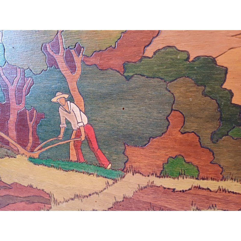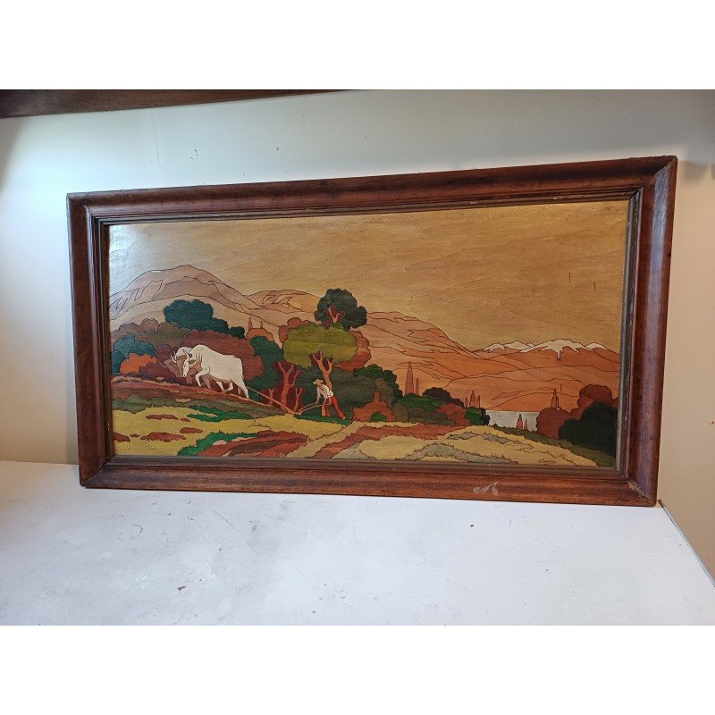 Painted Wood Panel, signed Clavere, Marquetry style, Height: 62 cm, Length and Width: 114 cm by 3.5 cm, in very good condition.