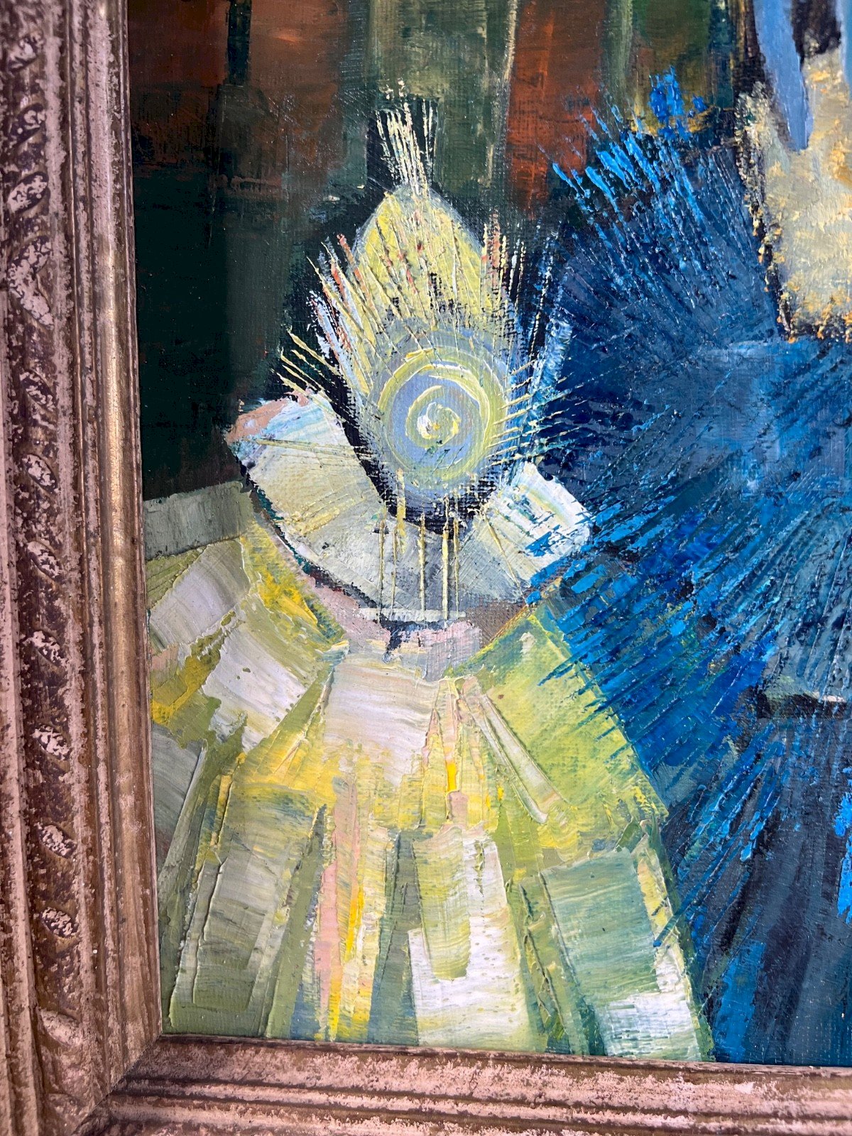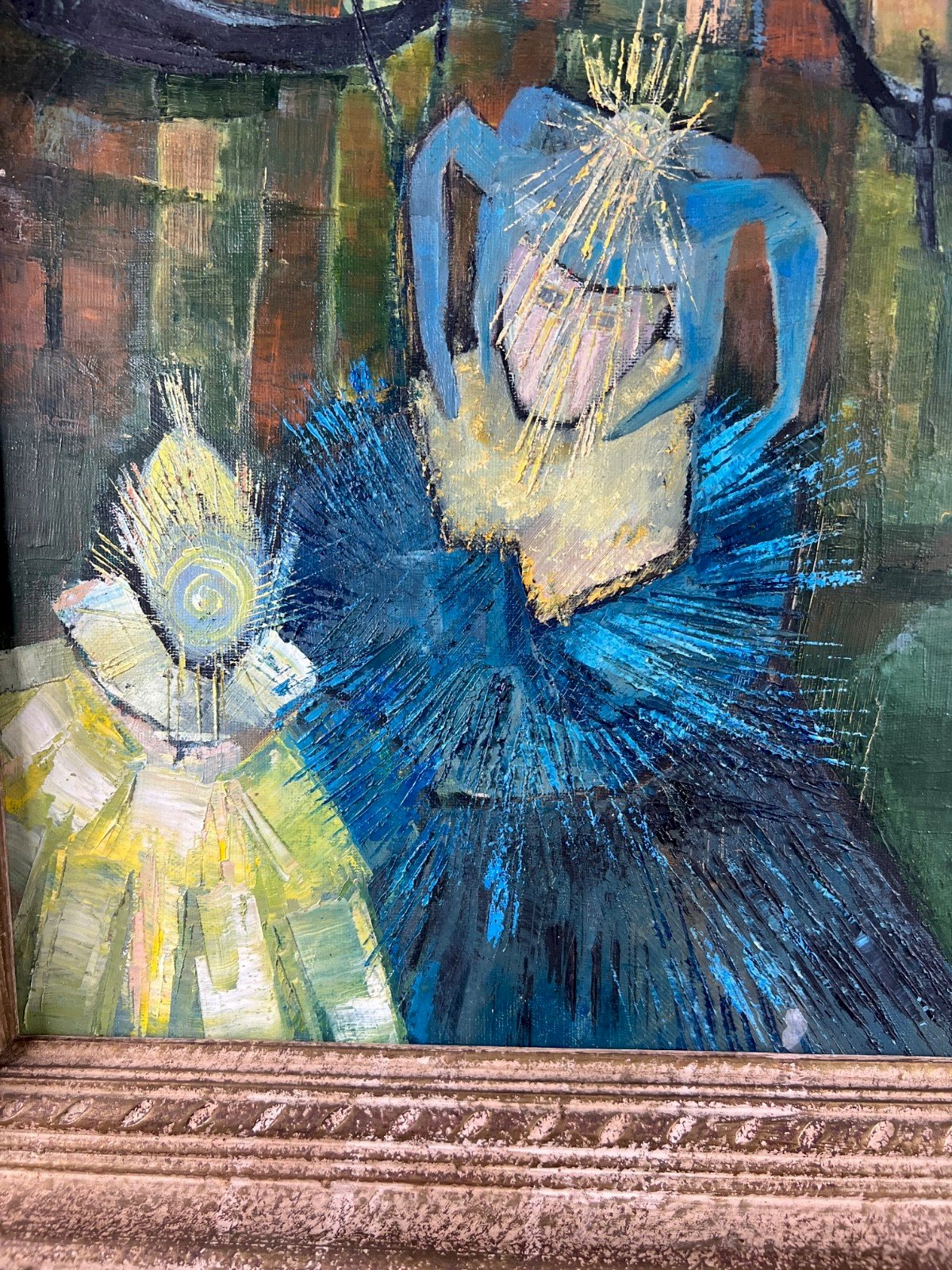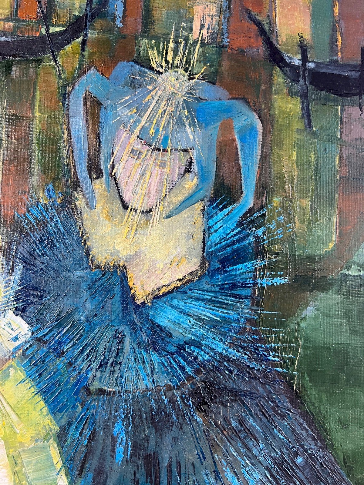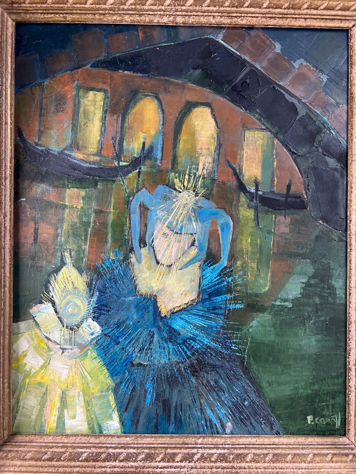Under the arches of a Venetian bridge, two masked silhouettes emerge from the night. Their shimmering costumes blend into the green and blue reflections of the canals, where the light seems to vibrate. The painter P. Caroll captures here the essence of the Carnival of Venice with an expressive, almost musical gesture that weaves together mystery, emotion, and lyrical abstraction. Details of the work: Artist: P. Caroll (signature in the lower right) Suggested title: Masquerade in Venice Period: circa 1960–1970 Technique: oil on canvas Dimensions without frame: 38 × 46.5 cm (15 × 18.3 in) Dimensions with frame: 47 × 56 cm (18.5 × 22 in) Frame: antique molded frame with a golden patina Condition: excellent overall condition Palette: shades of cobalt blue, emerald green, gold, and deep ochre Style: modern expressionism with impasto brushwork About the artist: The painter P. Caroll remains a little-documented artist, likely active in the 1950s–1970s in France or Italy. His style, vibrant and dreamlike, evokes post-cubist and expressionist trends: structured compositions, plays of light, and stylized silhouettes. A few similar works occasionally appear on the European art market, particularly with Venetian or carnival themes. Type: Oil Country of origin: France Features: On canvas