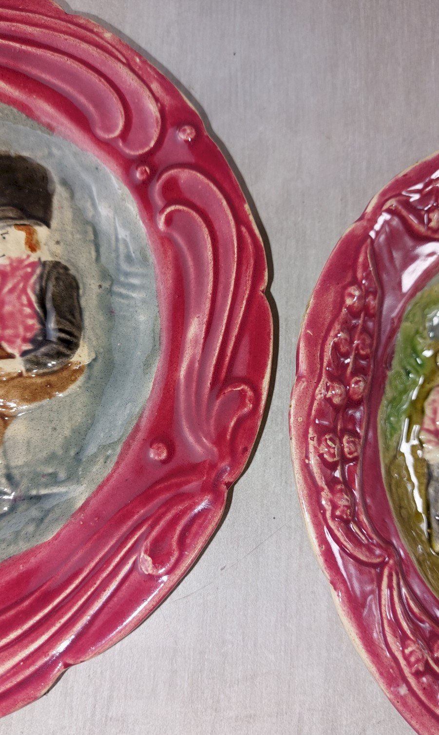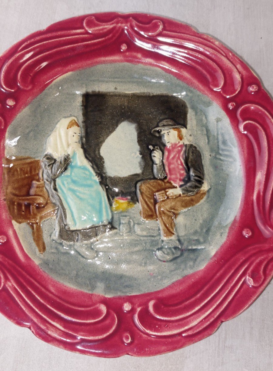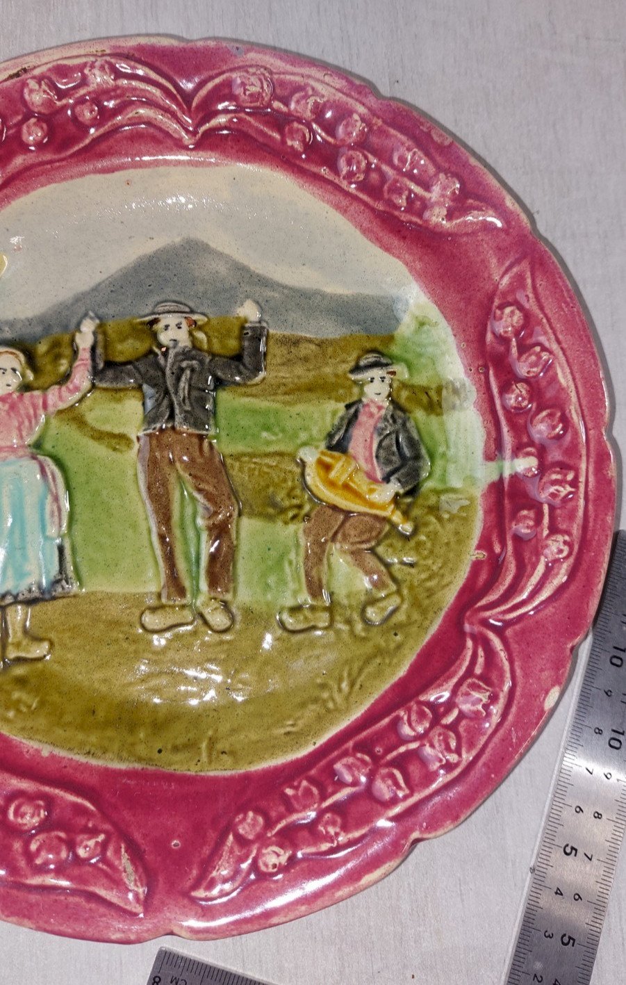Pair of vintage majolica plates, scenes of daily life in good condition, no cracks or chips but a few unmarked scratches, diameter 21.3 cm, see photos. Check out my other items! Reduced shipping costs for bulk purchases.