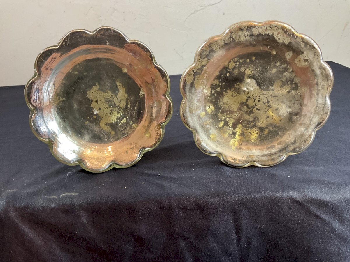 Pair of antique blown glass eglomisé candle holders, mercury.