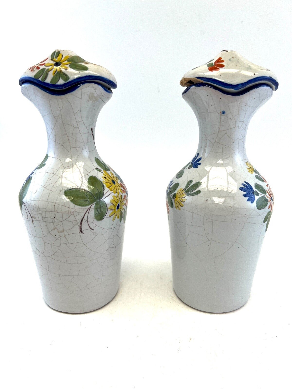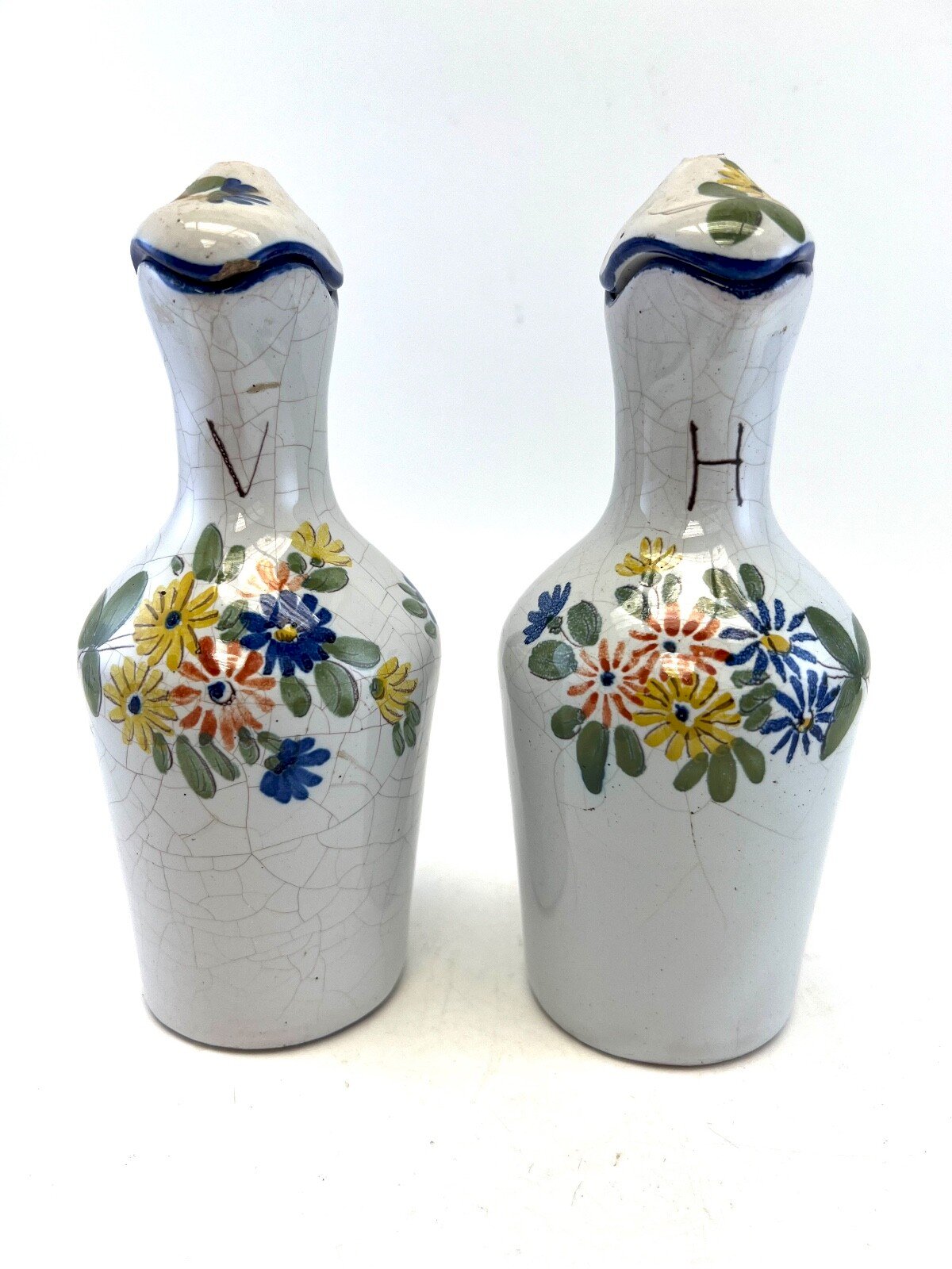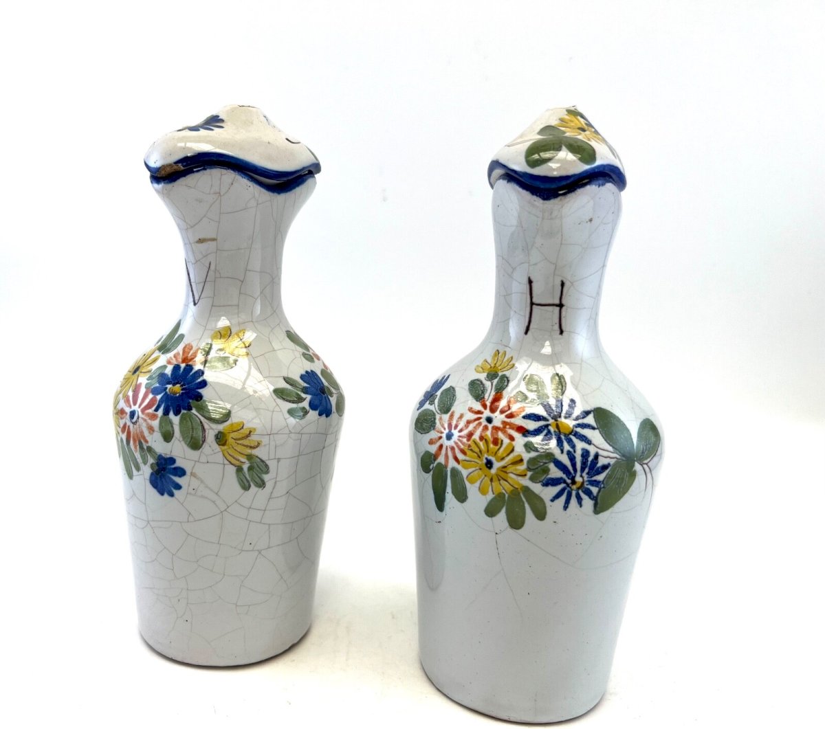 Pair of Antique French Faience Oil/Vinegar Cruets – La Rochelle / Nevers / Quimper – 19th Century Beautiful pair of antique French faience cruets, attributed stylistically to the traditional pottery centers of La Rochelle, Nevers or Quimper during the 19th century. Each cruet is hand-decorated with colorful floral motifs, showing a charming original crackled glaze typical of old French faience. Both pieces still have their original lids, although the small lid knobs are missing, a common detail for antique cruets of this type. A highly decorative set, perfect for a rustic French kitchen, a country-style interior, or a collection of regional faience. Details Period: 19th century Origin: France (La Rochelle / Nevers / Quimper – stylistic attribution) Type: Oil / Vinegar Cruet Material: Hand-painted faience Decoration: Polychrome flowers, crackled glaze Condition: Good antique condition – lid knobs missing Size: Height: 18 cm Width: 8.5 cm A charming and authentic French pair These cruets carry the soul of old French kitchens and the gentle spirit of handcrafted pottery. A delightful historic accent for any home or collection. Country of origin: France