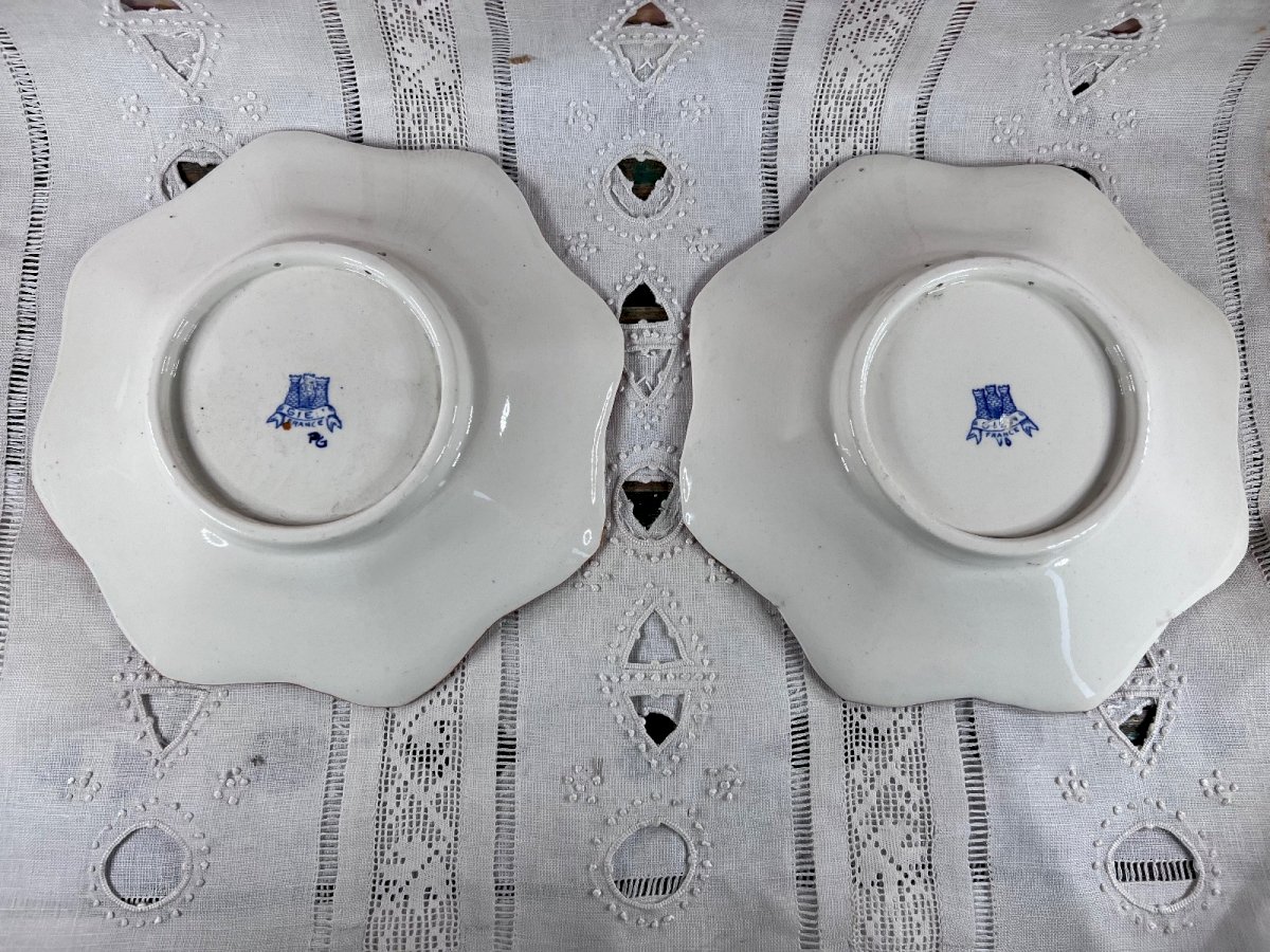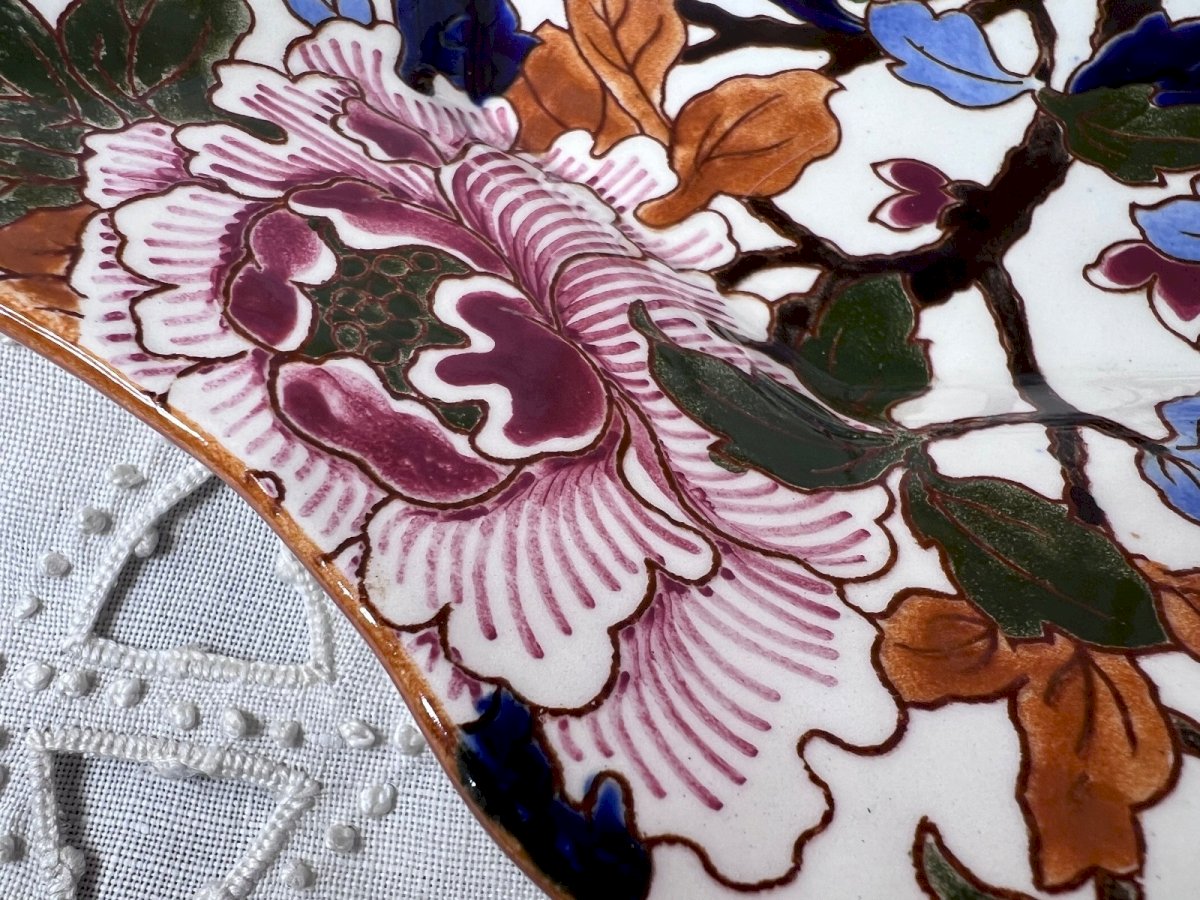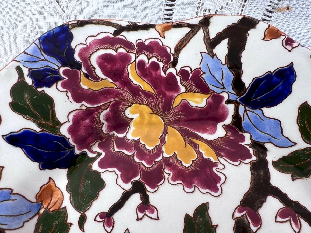 Pair of antique Gien earthenware plates with Peony decoration, richly adorned with polychrome floral motifs in a Japonese style, set against a white background, featuring an elegant wavy contour. These plates bear the blue stamp of the Gien factory on the back, one of the greatest references in French earthenware, and date from the late 19th or early 20th century. Perfect for display, wall decoration, or to enrich a collection of antique earthenware. In good condition. Dimensions Diameter: 22 cm. Antique Gien plates, Gien earthenware, antique floral plates, 19th-century French earthenware, decorative plates, pair of antique plates. Careful and very well-protected shipping. Contractual photos – questions welcome before purchase. Country of origin: France.