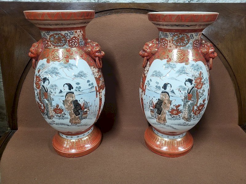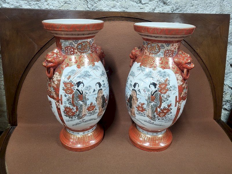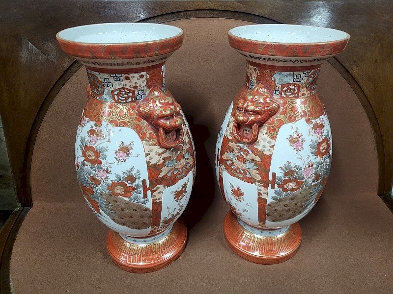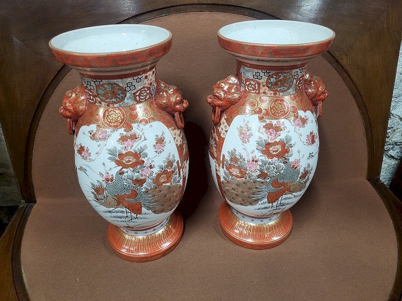 Beautiful pair of Asian vases signed on the bottom. They are in very good condition, and it is a very beautiful and authentic pair as they are a match in terms of the characters. There is a peacock decoration on the reverse side. It is a very nice model; they measure 36.5 cm in height, 18 cm in diameter, and 15.5 cm in diameter at the neck.