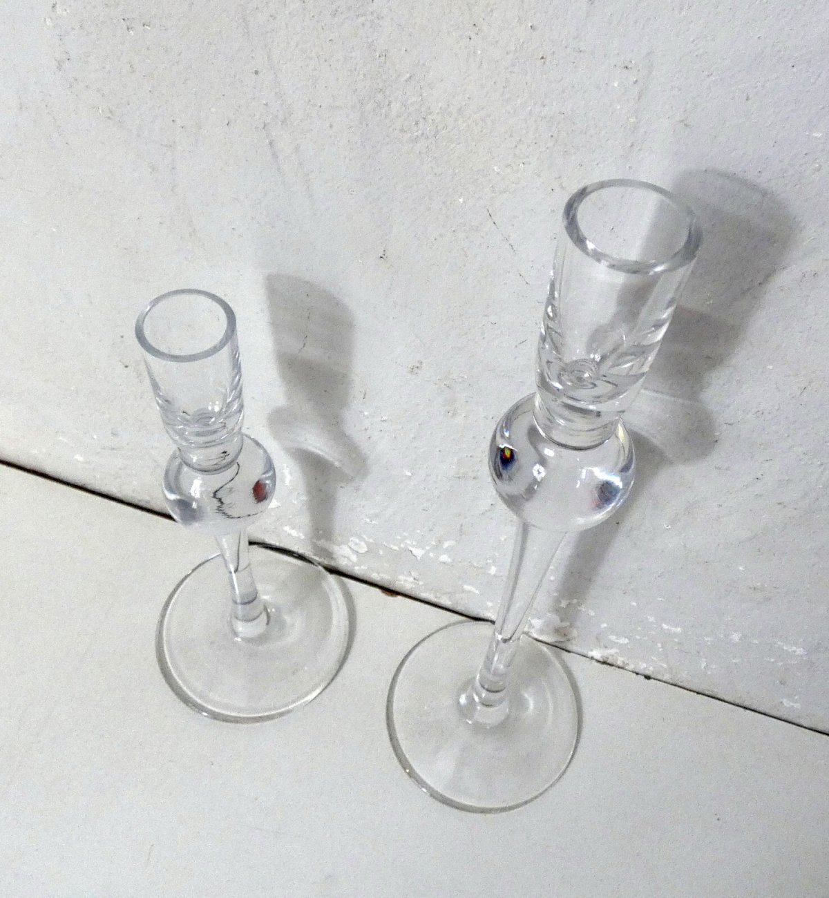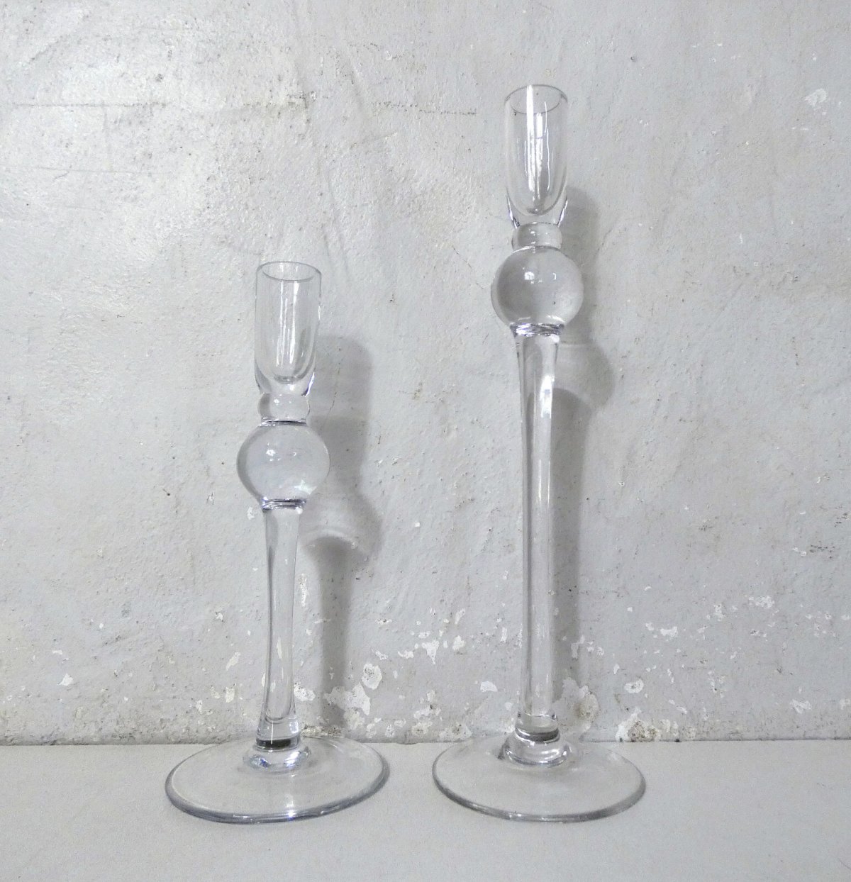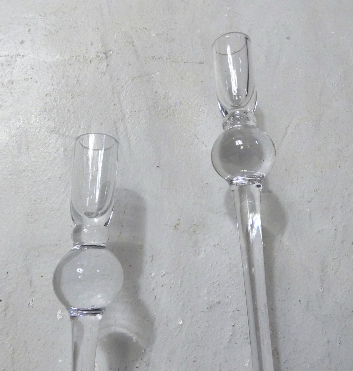 Pair of blown glass candle holders. Height: 30.5 and 22.5 cm. Base diameter: 8.5 cm. In perfect condition.