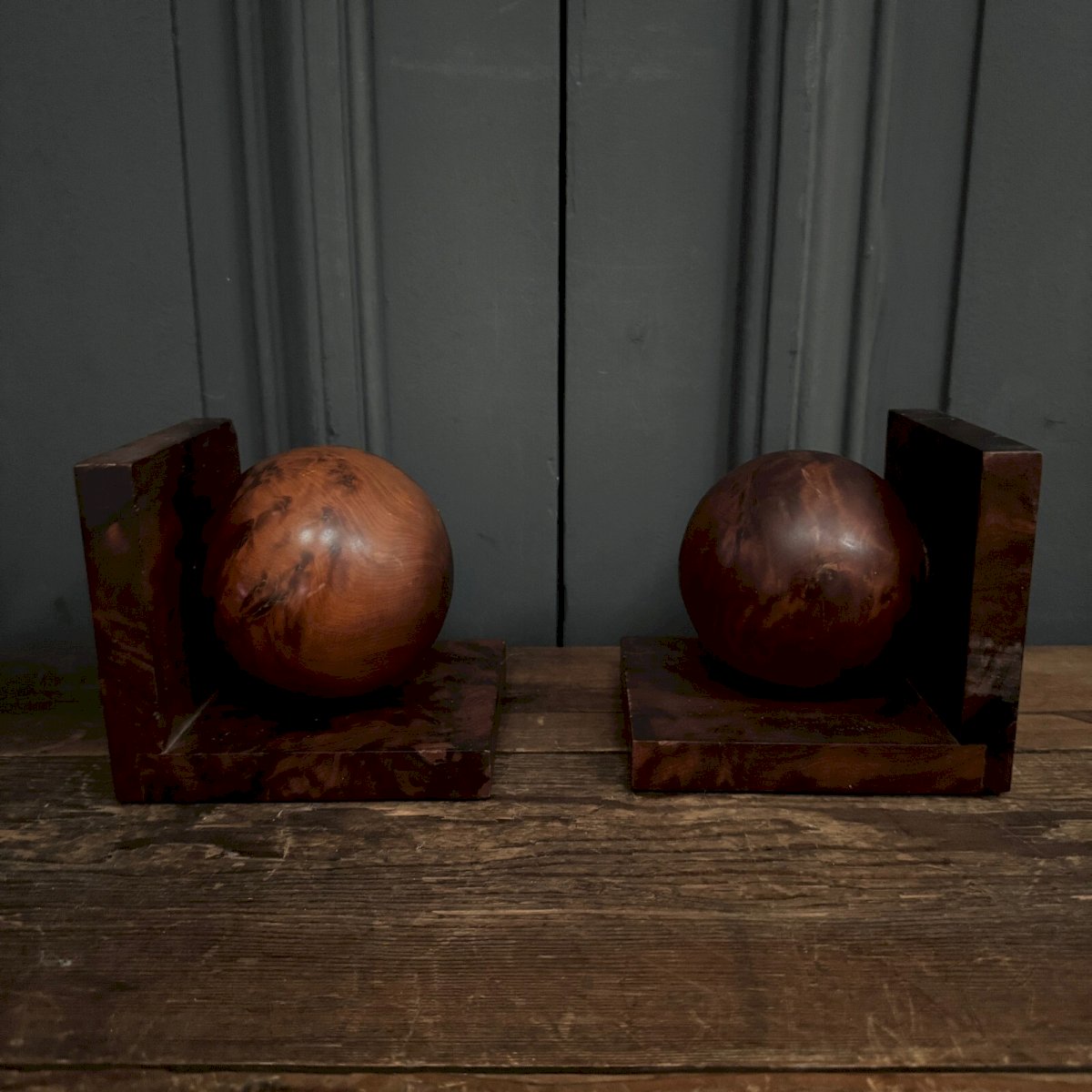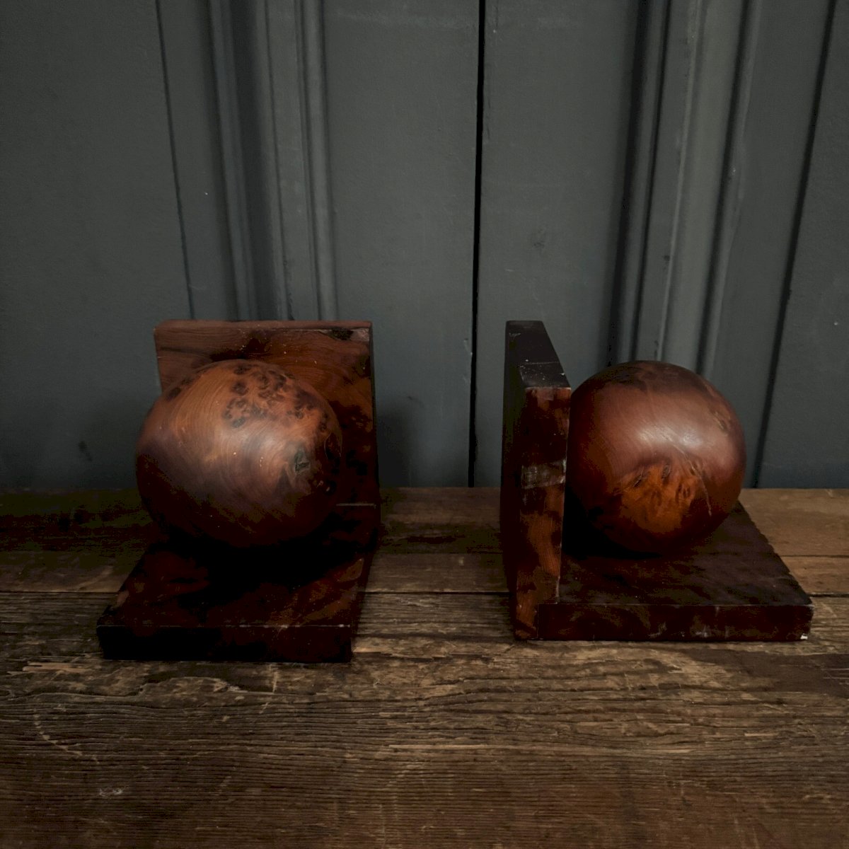 Pair of bookends in burl wood 1950 Art Deco L9230 These bookends are very geometric and are a work from the 1950s inspired by Art Deco. We note some friction and signs of wear. However, these bookends remain in an acceptable but not perfect condition. Our photos allow you to appreciate the quality of these objects. For the condition, please refer to the detailed photos. Feel free to zoom in. The photos are an integral part of the description. Dimensions: Height: 13 cm Width: 12 cm Depth: 14 cm Diameter: 10 cm A: MBCLFJ7SWQ P: 1593524 I remain at your disposal for any questions. Type: Showcase item, Decorative Period: 20th-century Design Subtype: Bookends Height: 13 cm Material: Wood Style: Art Deco Width: 12 cm Country of origin: Metropolitan France