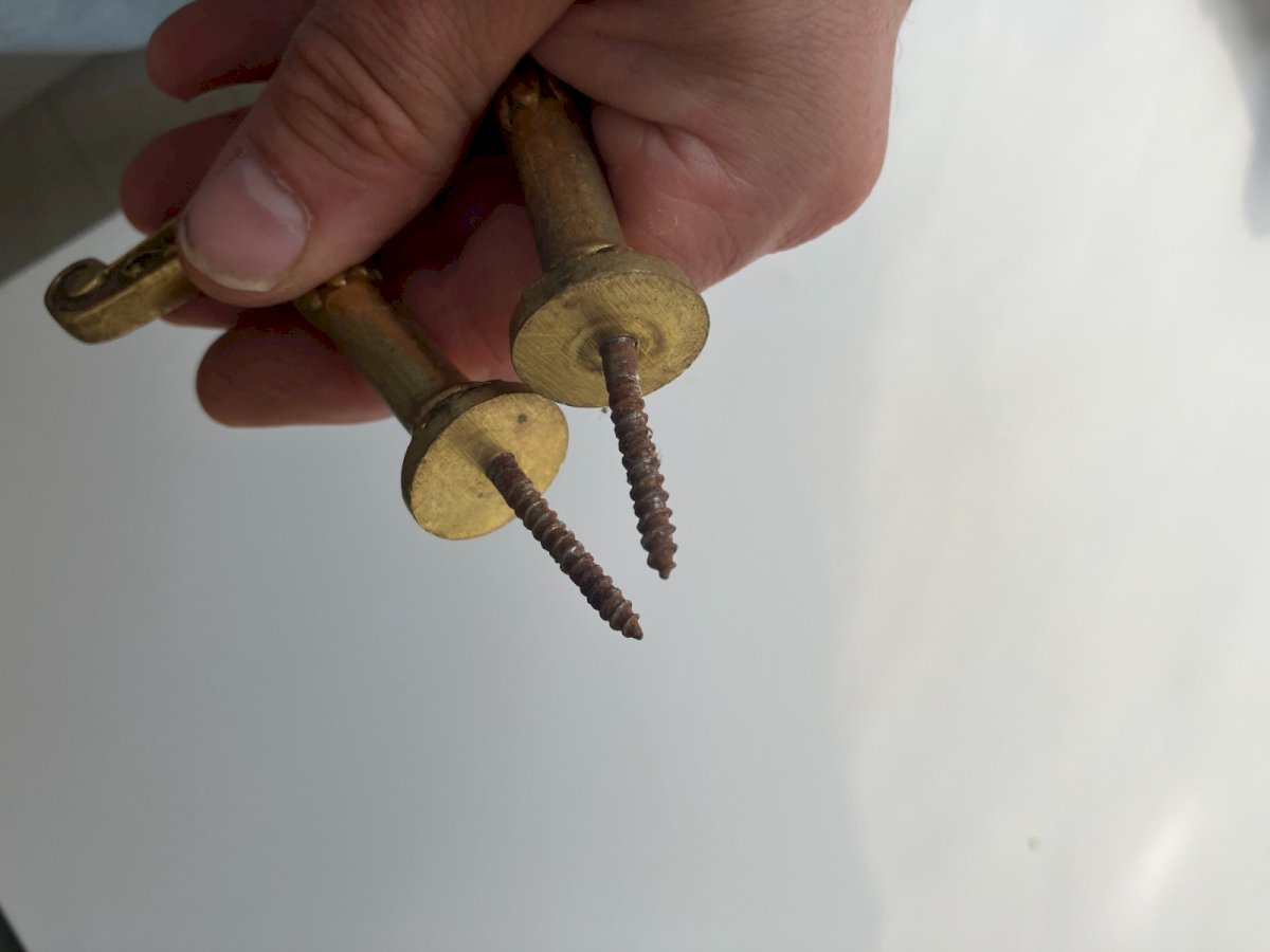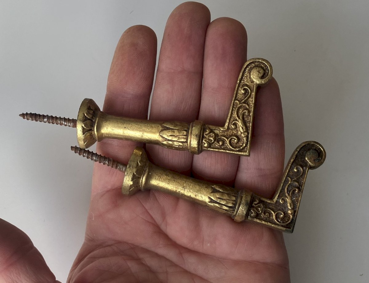 Pair of brass curtain tieback hooks to screw in, length 7.4 cm (without fixing screws) good condition, shipped via tracked letter, a second identical pair available, see my other listings. Condition: Used item that has been used. Item shows some superficial signs of wear, fully operational and functioning correctly. It may be a demonstration model or an item returned to the store after a short period of use. Possible imperfections. Color: Gold Type: Tieback Material: Brass Items included: Hook