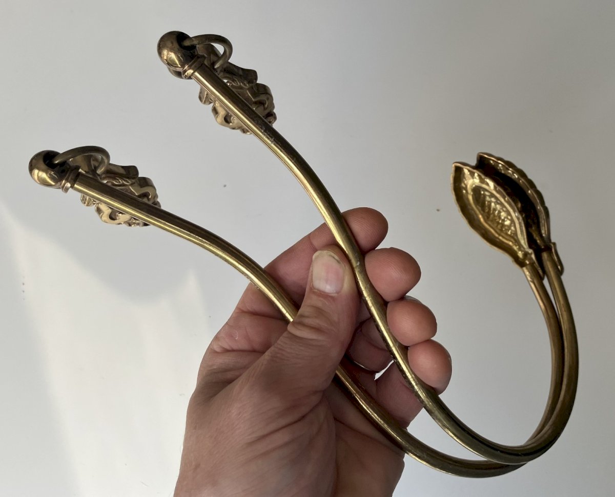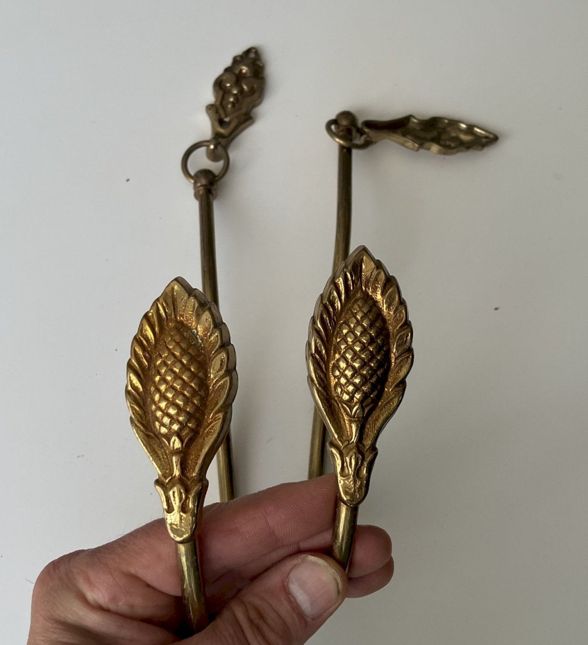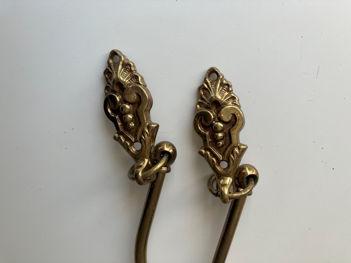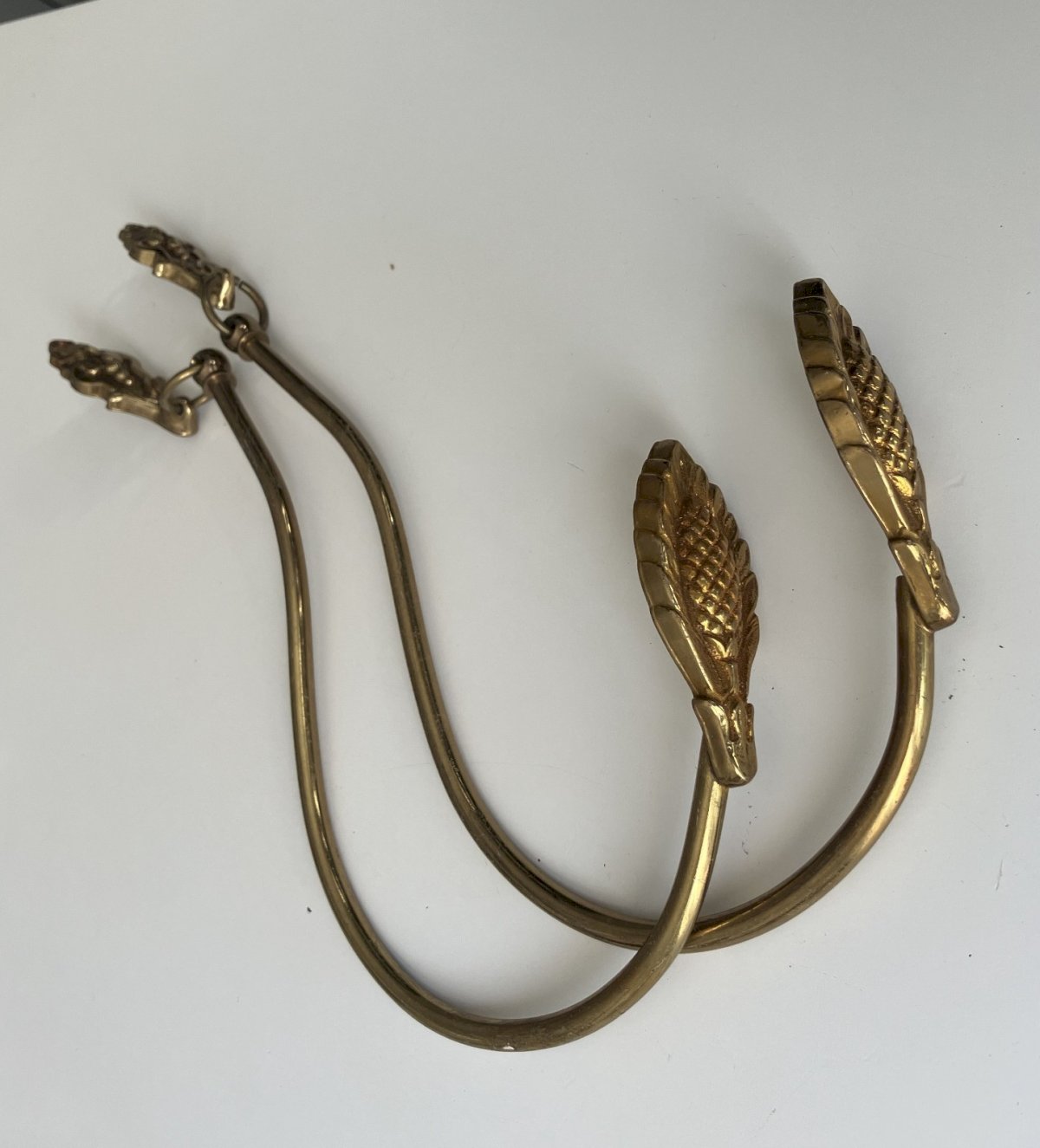 Pair of brass curtain tiebacks with pine cone decor, used, good condition, height 31 cm, shipping via Mondial Relay. Condition: Used item that has been used. Item showing some signs of superficial wear, fully operational and functioning correctly. It may be a display model or an item returned to the store after a short period of use. There may be possible imperfections. Color: Gold Type: Tiebacks.