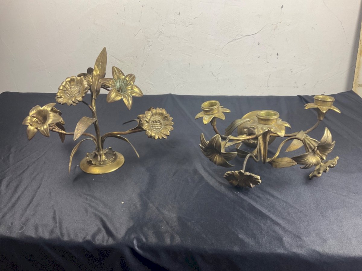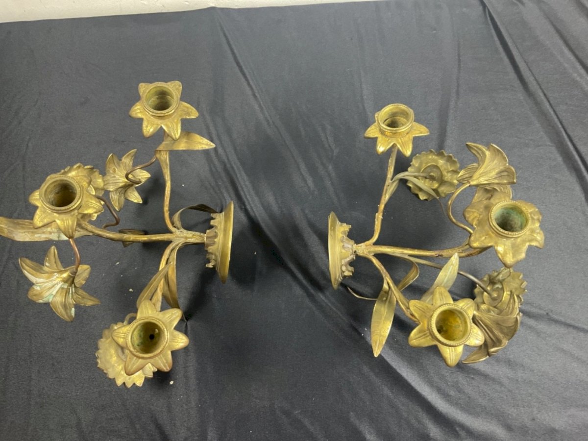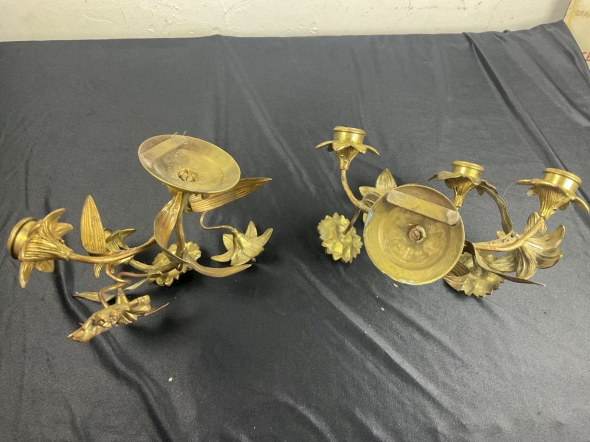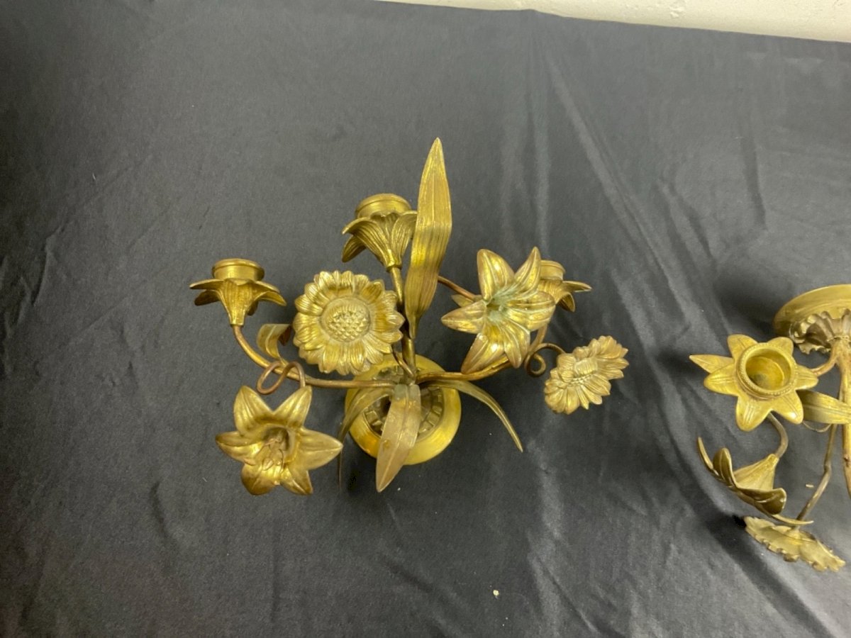 PAIR OF CHURCH ALTAR CANDELABRA WALL SCONCES GILD BRONZE 19TH CENTURY Width: 25 cm Height: 16 cm Condition: Used item. Please check the seller's description for more details... Used item: Object that has been used. any imperfections. Type: Christianity Subtype: Reliquary Country of manufacture: France Material: Bronze