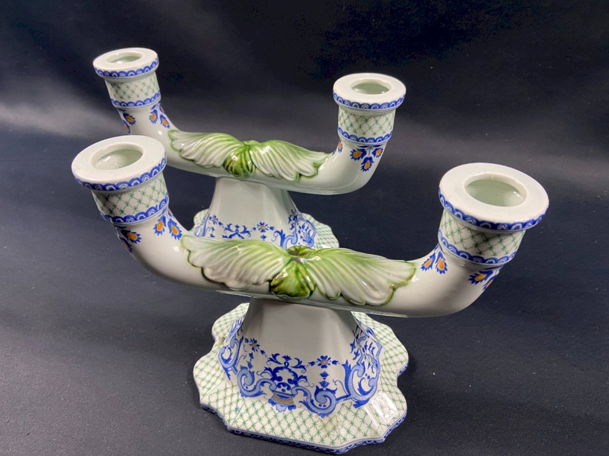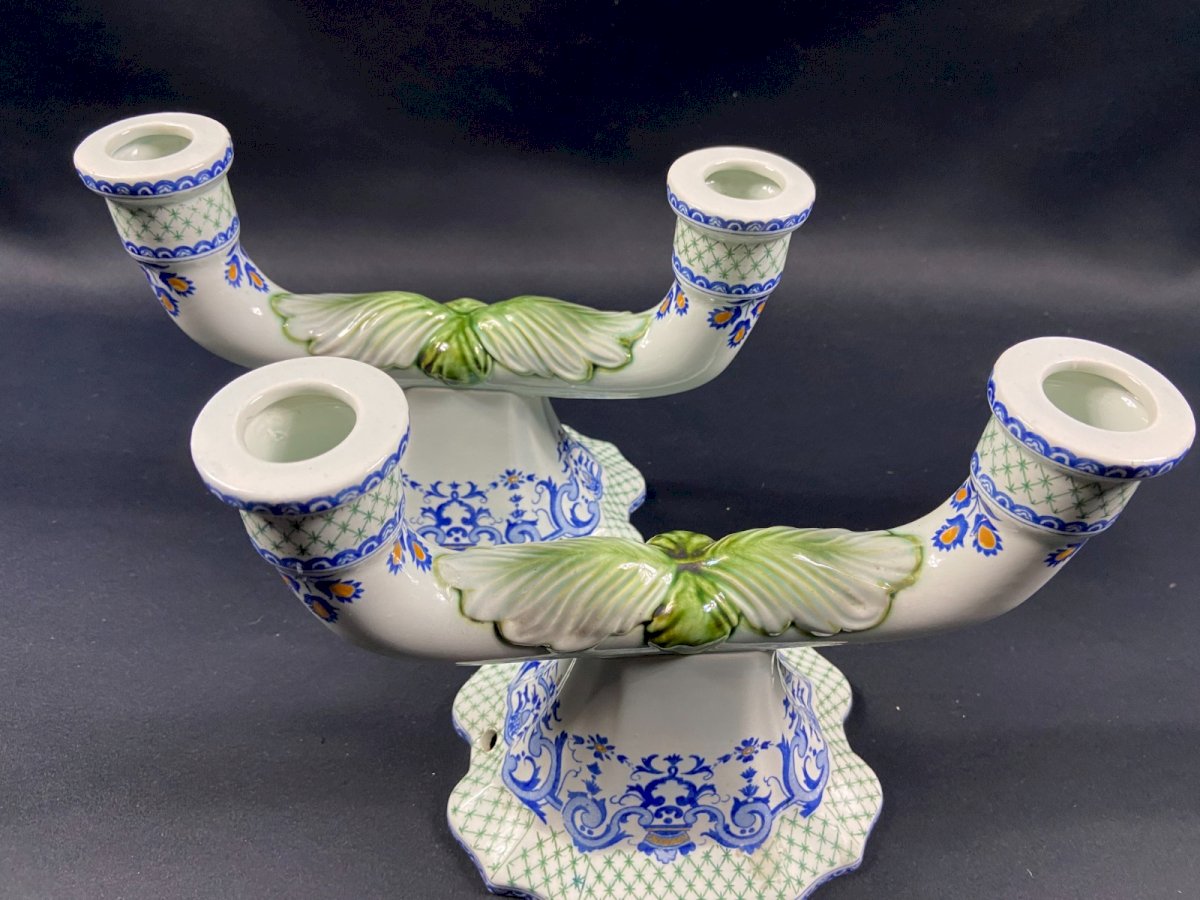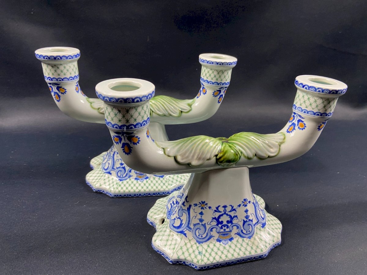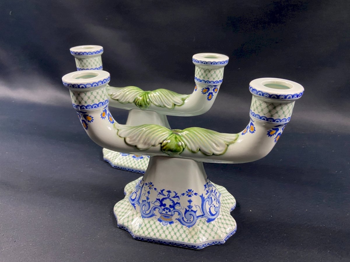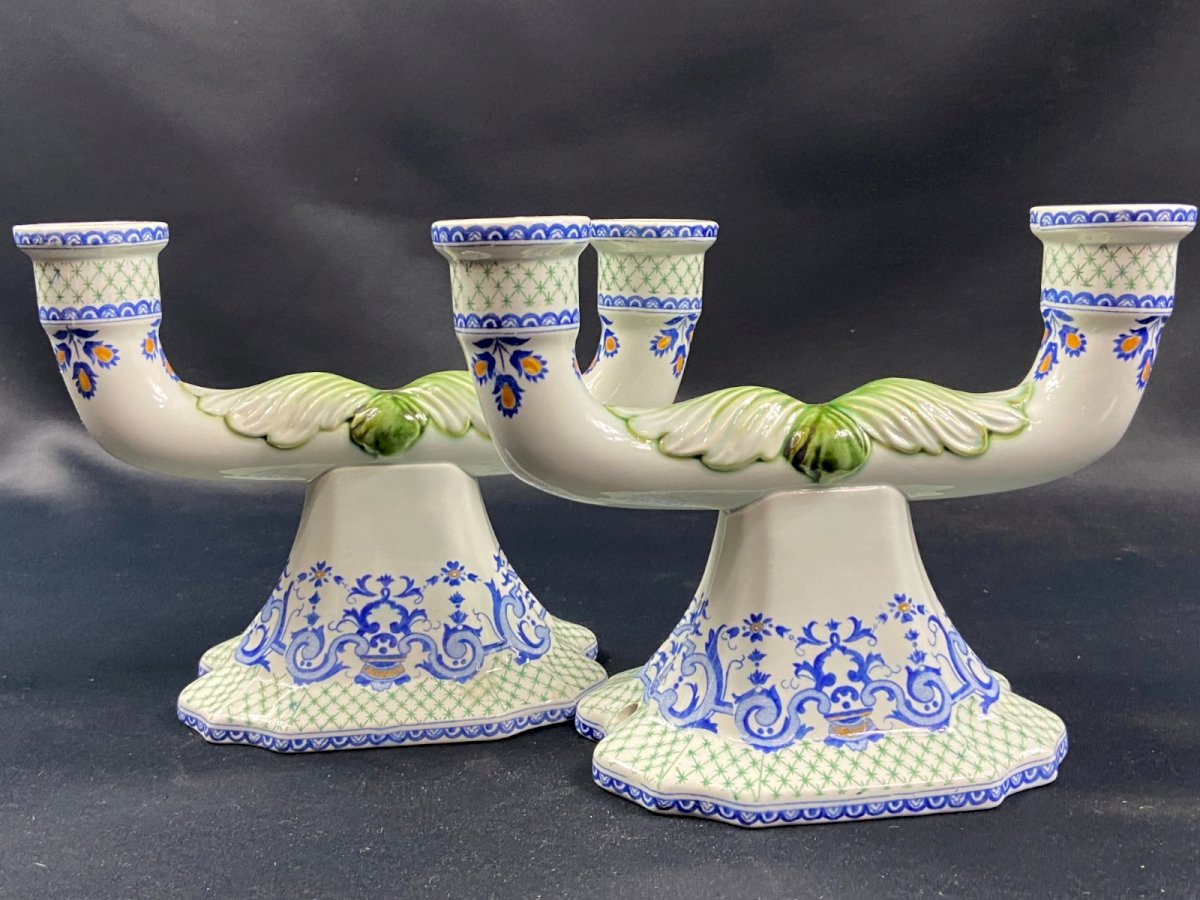 Pair of table ends, candlesticks, Gien earthenware candelabra, Regency style 20th century. Very good condition. Undeniable elegance. Max dimensions: Wingspan 23.4 x Height 16.6 cm / base 15 x 11.3 cm. Total weight: 951 grams. Presence of cable passage holes for potential electrification. - Ultra-secure shipping worldwide - Pickup of orders possible by appointment, Notre-Dame street in Bourges. - Possibility of grouping in the same package: please contact me beforehand so that I can calculate your optimized shipping costs. Country of origin: France.