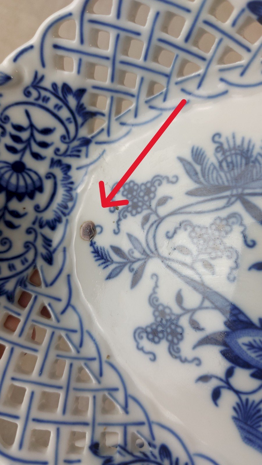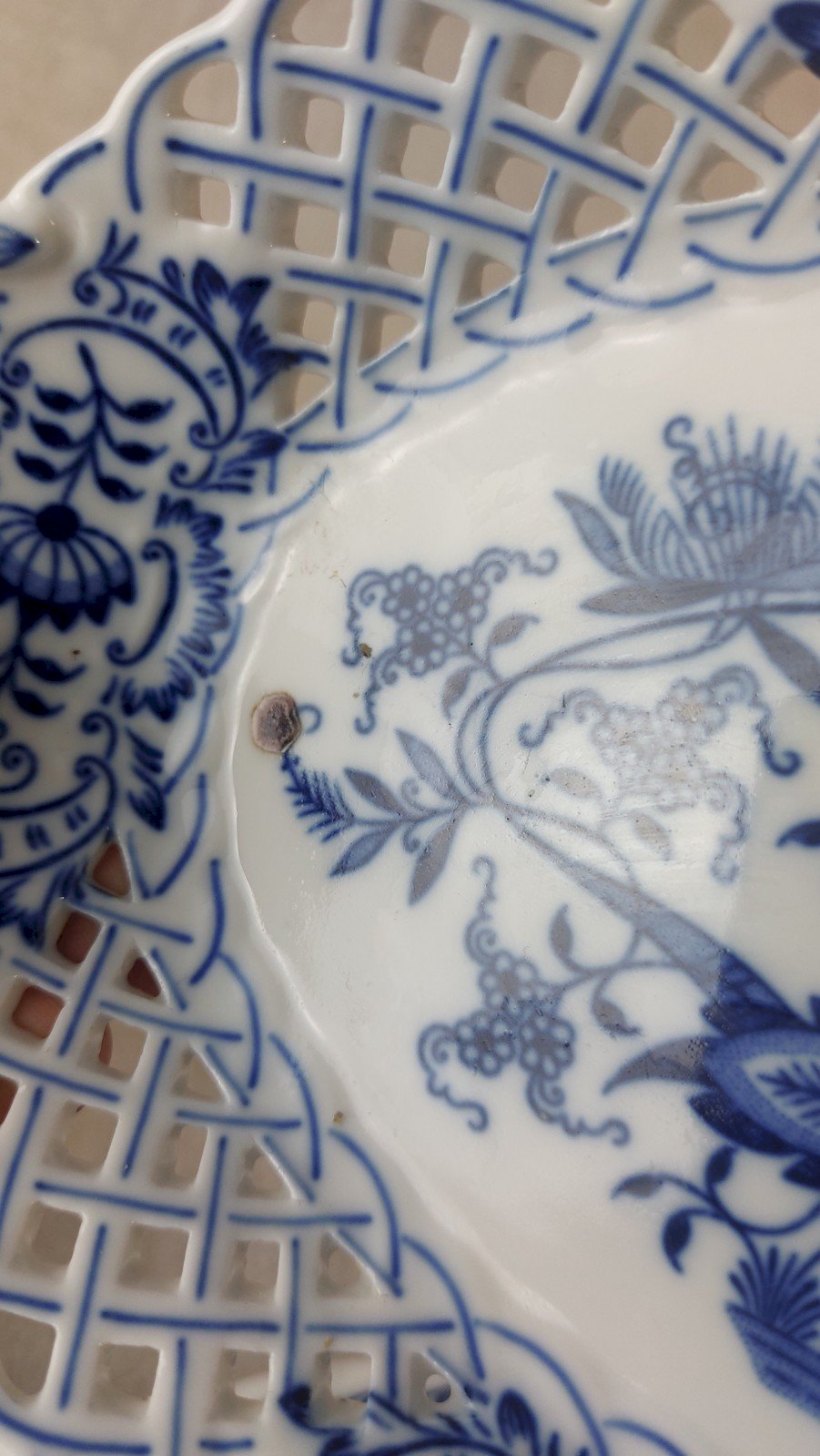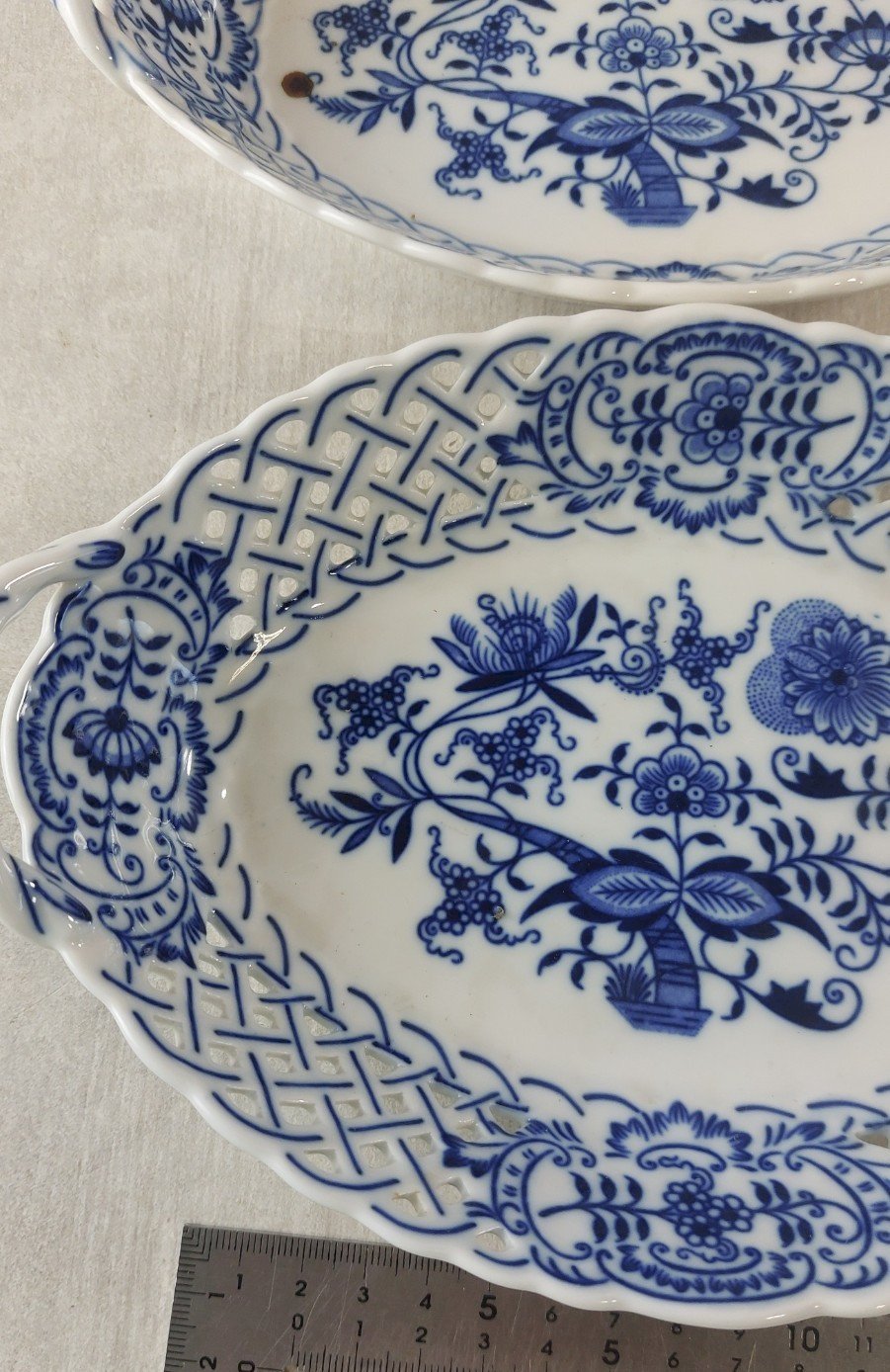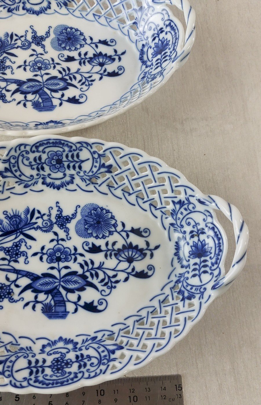 Pair of empty pockets / openwork basket, Blue Onion décor / onion flowers / Zwiebelmuster, made of porcelain from Czechoslovakia / Czech, Meissen style, no cracks or chips, one defect on an empty pocket marked Czechoslovakia dimensions 22 cm X 15 cm height 3.8 cm see photos Check out my other items! reduced shipping costs for bulk purchases