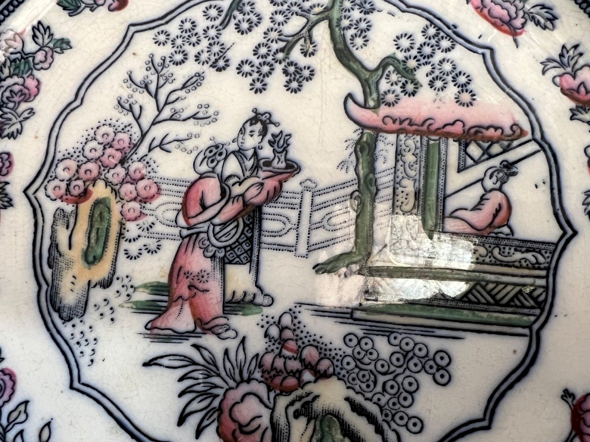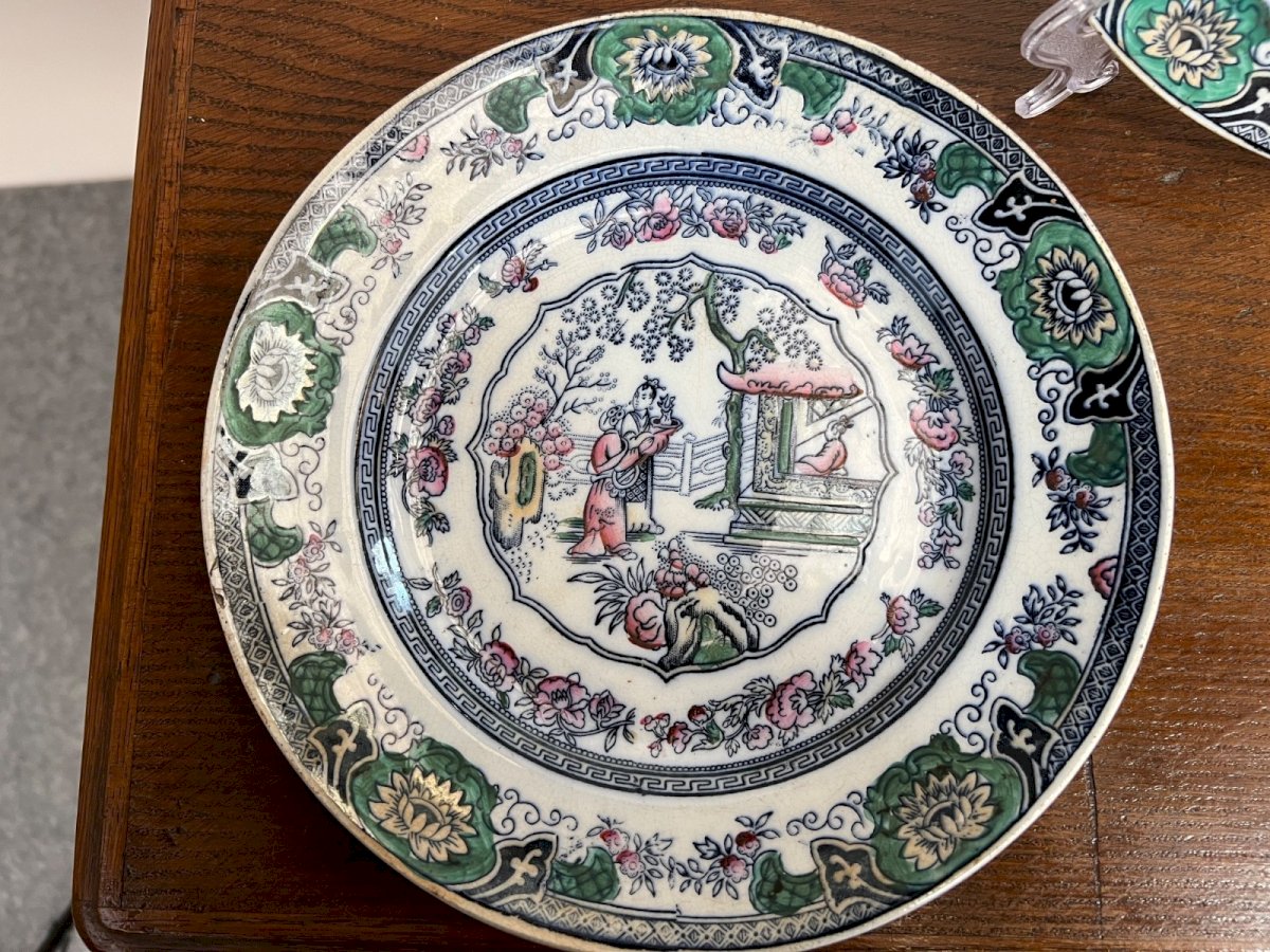 Pair of antique faience plates – Faience factory of Jemmapes (Belgium) – 19th century Charming pair of fine faience plates with a romantic chinoiserie decoration. The center features an orientalist scene: a musician character in a garden, stylized architecture, and flowering vegetation. The border is richly adorned with deep green, powder pink, and black floral motifs on an ivory background. A typical aesthetic of 19th-century Anglo-Belgian taste, inspired by Far Eastern porcelains. ✔ Manufacture: Jemmapes (Belgium) ✔ Period: 19th century ✔ Decor: Polychrome Chinoiserie ✔ Sold as a pair Condition: Good overall condition with signs of wear consistent with age and slight marks underfoot. No visible cracks. Ideal for wall decoration, chic country kitchen, English cottage interior, or collection of antique faiences. Diameter: 23 cm (9.05 inches) Country of origin: Belgium