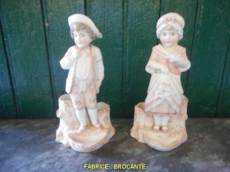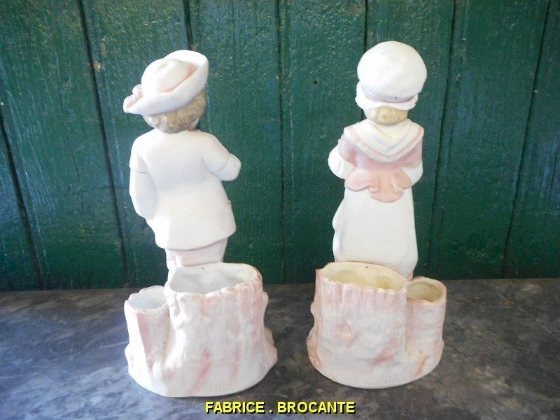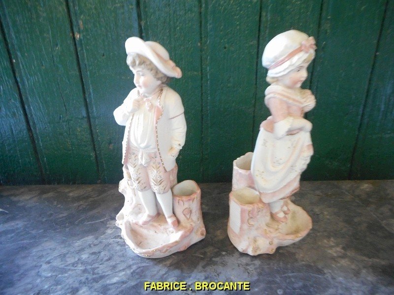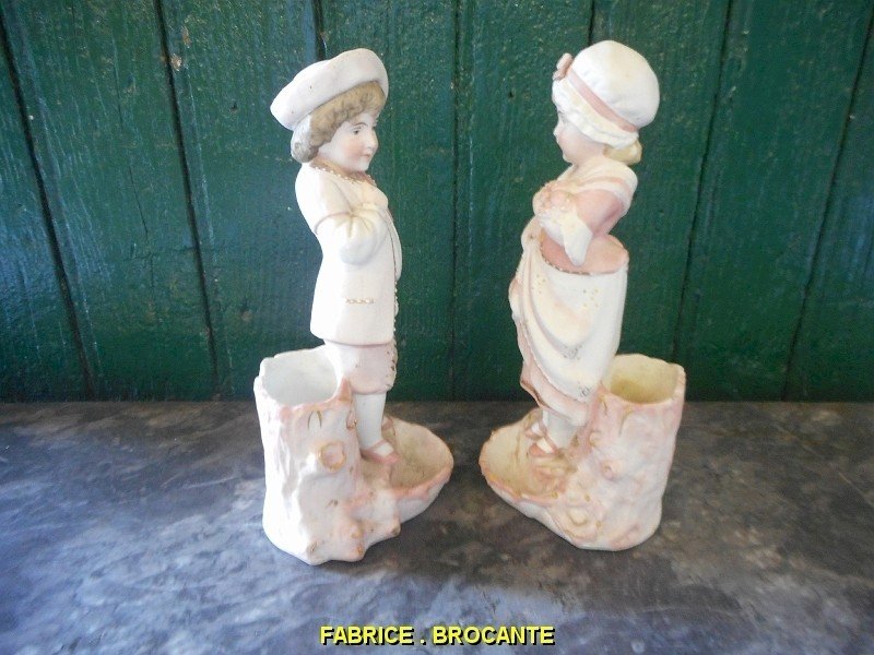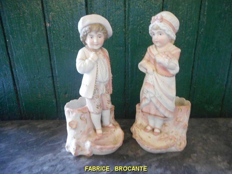 Superb pair of colored bisque vase figurines, they are in very good condition, they just need to be cleaned. They measure 24.5 cm in height, 12 cm in width, and 10.5 cm in depth.