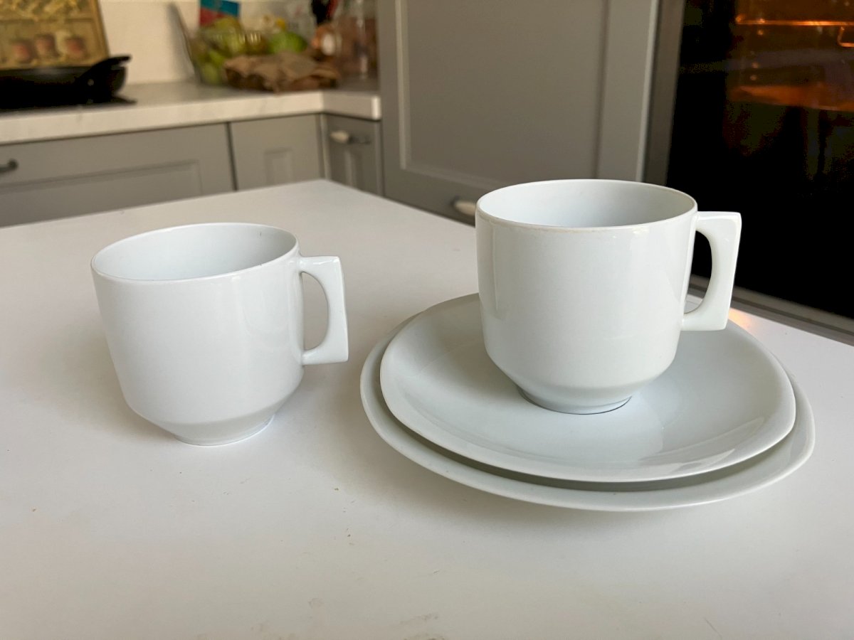 pair of cups and saucers Limoges Bernardaud B & Co one of the saucers is bigger than the other? cup dimensions height 6.1 cm diameter at the top 6.3 cm saucer dimensions 13.2x12.3 cm and 14.5x13.7 cm in good condition shipping via MONDIALRELAY