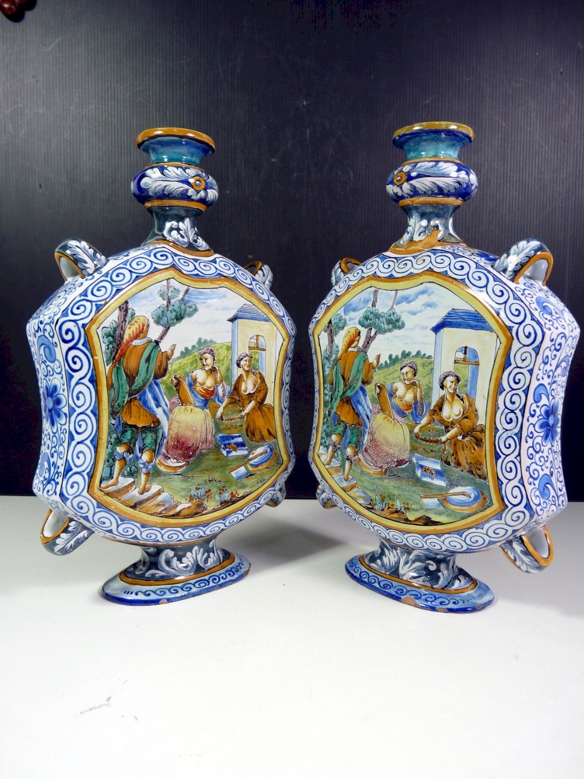 Pair of faience vases Blois? 19th century majolica decoration, signatures. Generally in good condition, several chips, see photos. Dimensions: Height: 29 cm, Width: 18 cm, Depth: 6 cm, Total weight: 1925 gr. Country of origin: France.