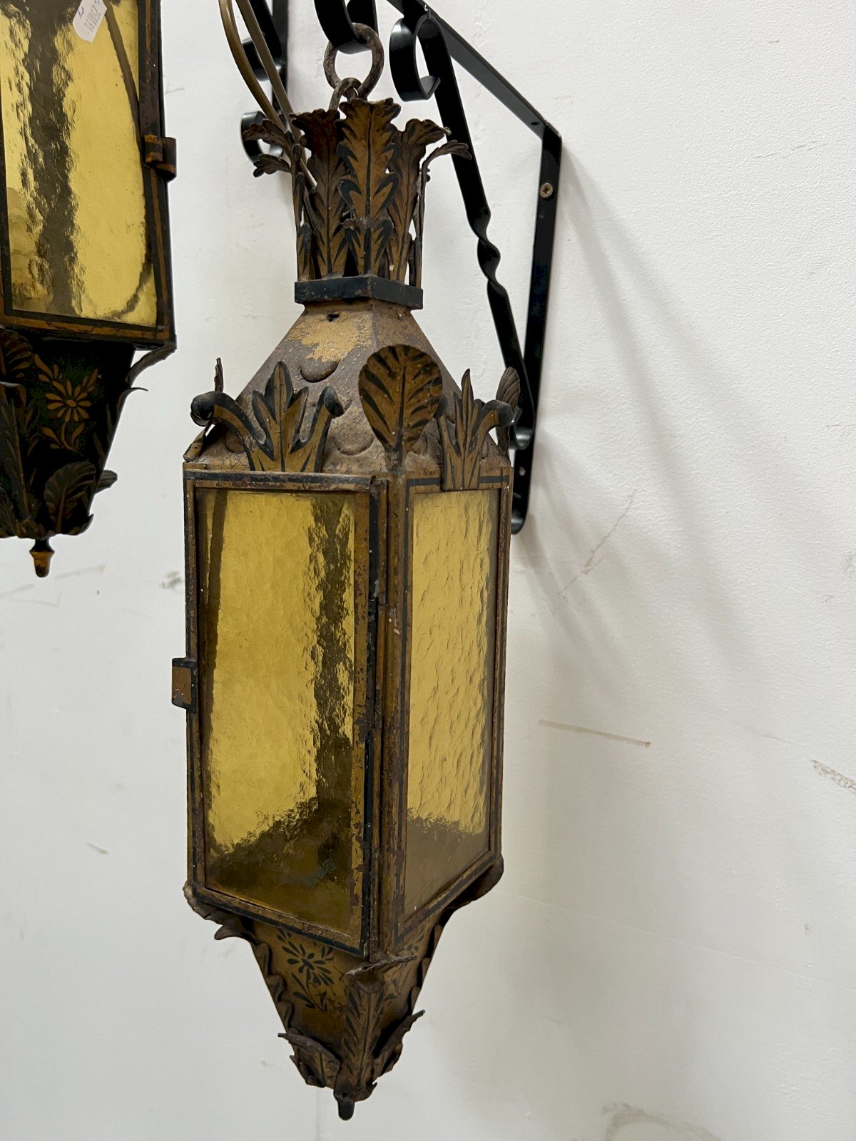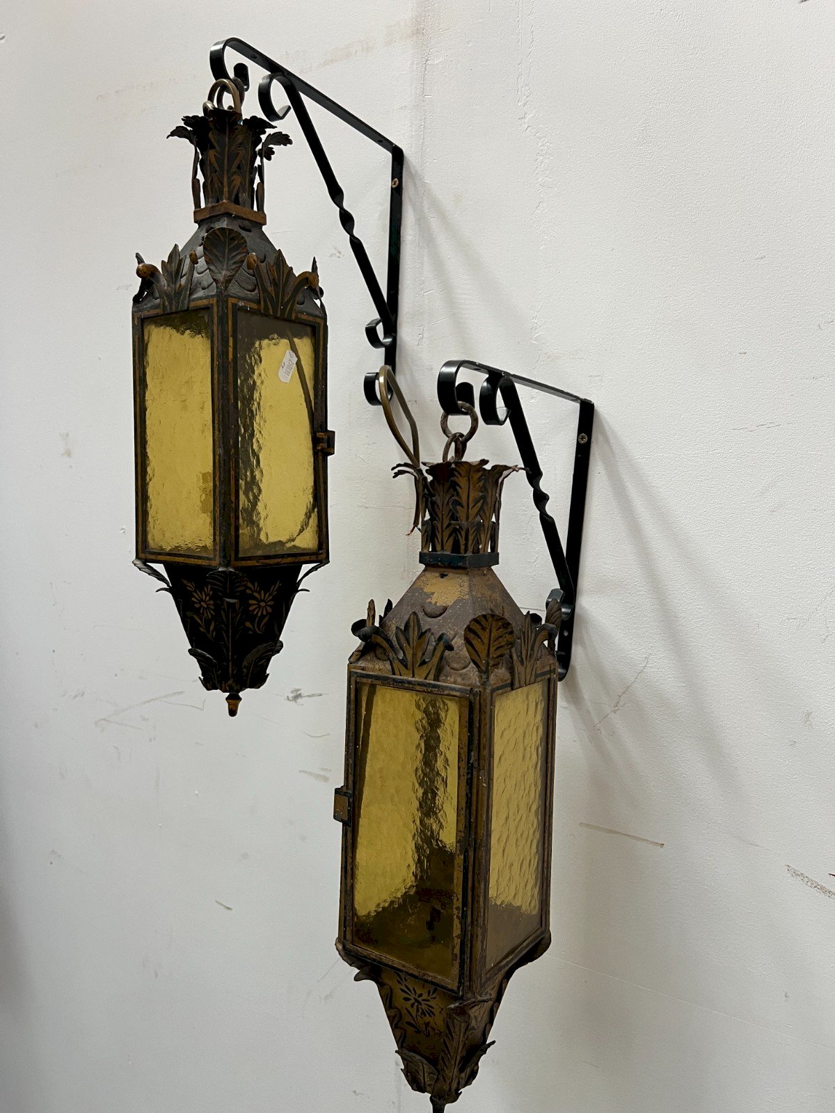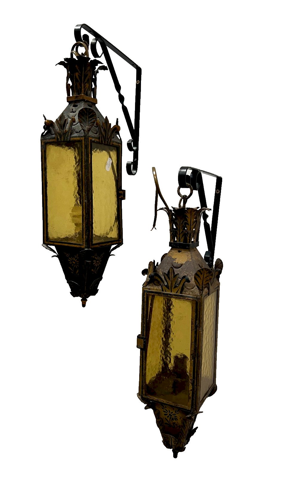 Pair of lacquered tin lanterns Floral pattern decoration Good condition Dimensions H 50 x W 12 x D 12 cm XX century Type: Wall light Period: Art Deco Country of manufacture: France Height: 50 Material: tin Style: Classic Length: 12 Width: 12