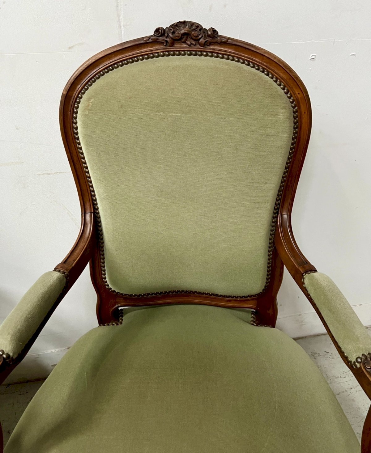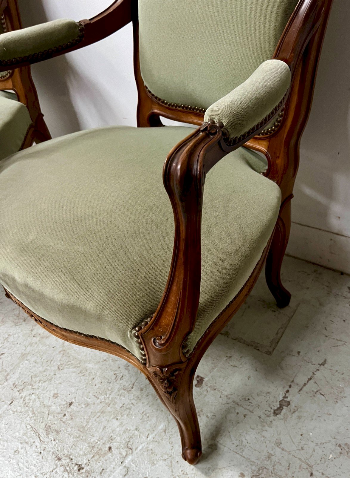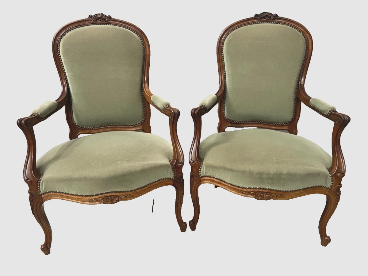 A pair of Louis XV style armchairs in walnut. Sculpted frame with flowers and foliage. Upholstery in good condition. Chairs upholstered in green pile velvet. Stable and robust pair of armchairs. Dimensions: H 105 x W 60 x D 55 cm. Period: 20th century. Number of pieces: 2. Type: Armchair. Origin: France. Subtype: Cabriolet. Country of origin: France. Material: Walnut. Style: Louis XV, Neoclassical.